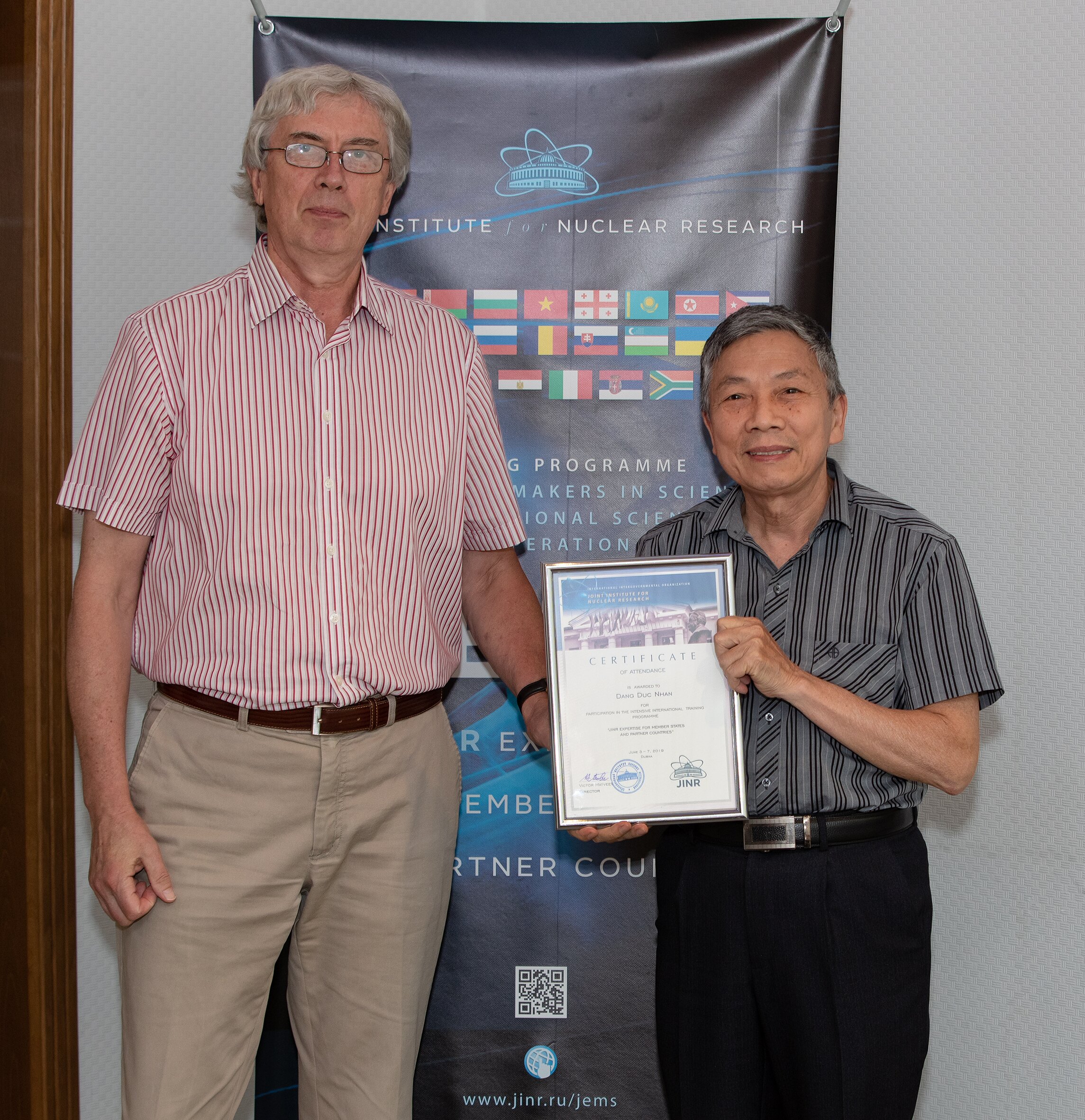 7 июня итоги работы программы JEMS-12 были подведены на традиционной встрече в формате круглого стола, закончившегося торжественным вручением участникам сертификатов. От имени дирекции ОИЯИ на круглом столе участников JEMS приветствовал вице-директор академик Борис Шарков, отметивший в своей речи, что руководство ОИЯИ видит большую практическую пользу стажировки JEMS в том, что она дает возможность прямого контакта с ответственными лицами научных и образовательных организаций стран-участниц и стран-партнеров ОИЯИ.