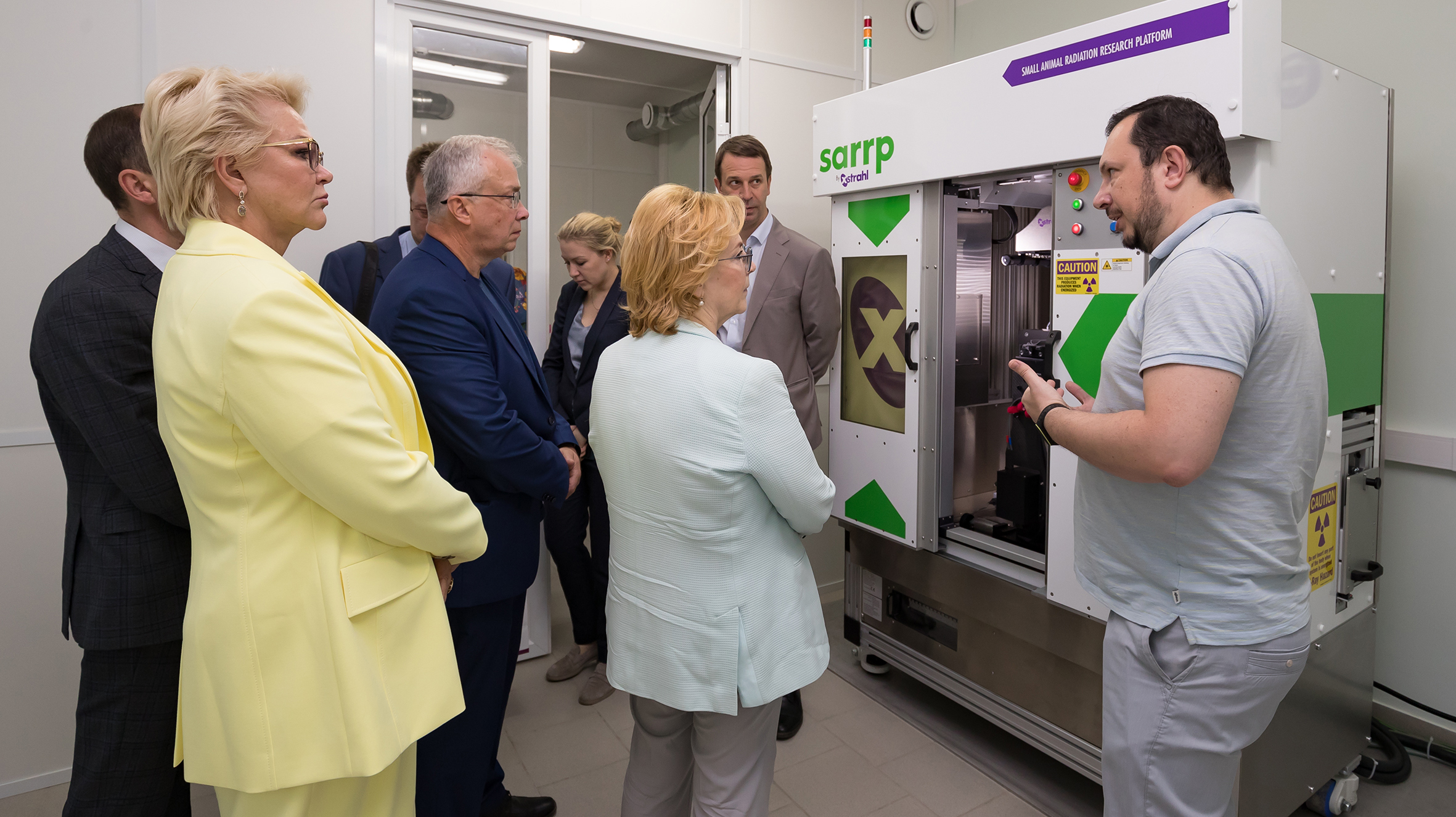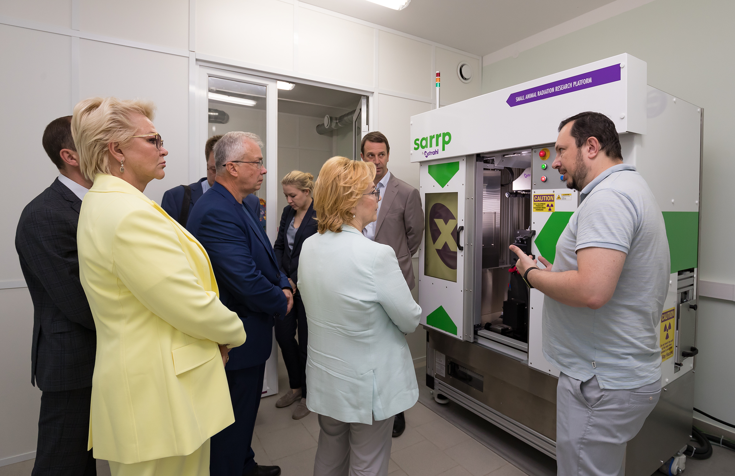 At JINR, Veronika Skvortsova and her First Deputy Tatiana Yakovleva visited the Laboratory of Radiation Biology, where the guests were presented with the SARRP X-ray facility for radiobiological studies on small laboratory animals. While getting acquainted with the scientific work of the Flerov Laboratory of Nuclear Reactions, Veronika Skvortsova examined the DC-280 cyclotron and visited the nanocentre. During the visit to Dubna, the FMBA delegation also visited the units of Dubna Medical Unit No. 9.