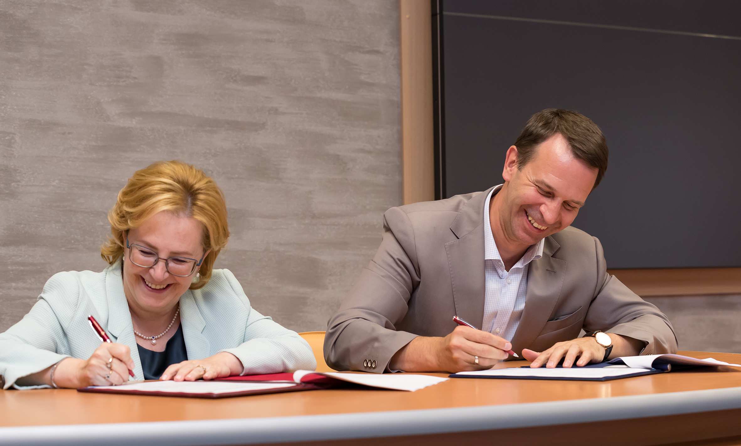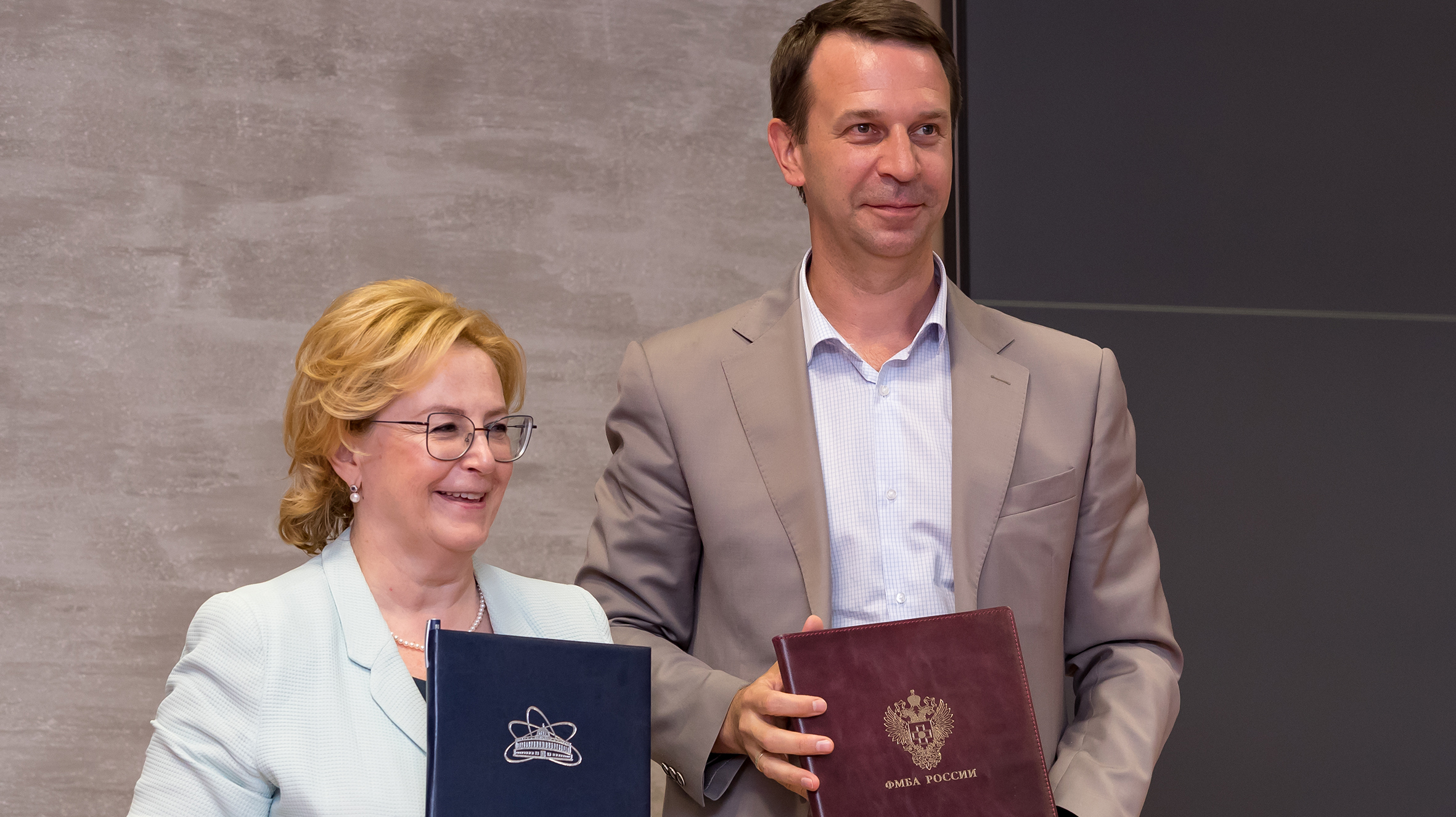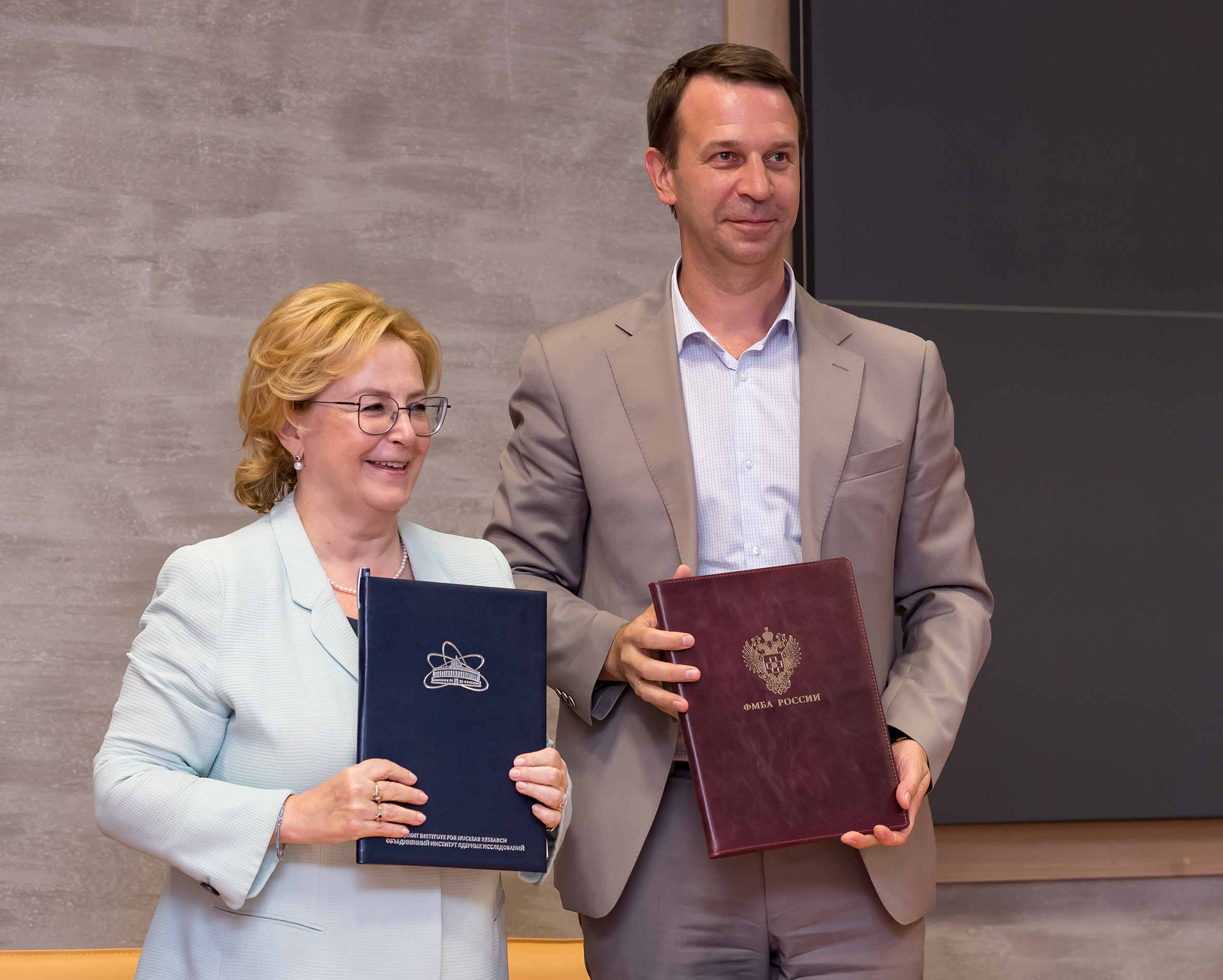 When signing the agreement, JINR Director Grigory Trubnikov expressed his gratitude to the head of FMBA. He noted that it had been only one year since Veronika Skvortsova’s first visit as Head of FMBA to Dubna, when the partnership roadmap was signed, the first results of this cooperation are already visible.