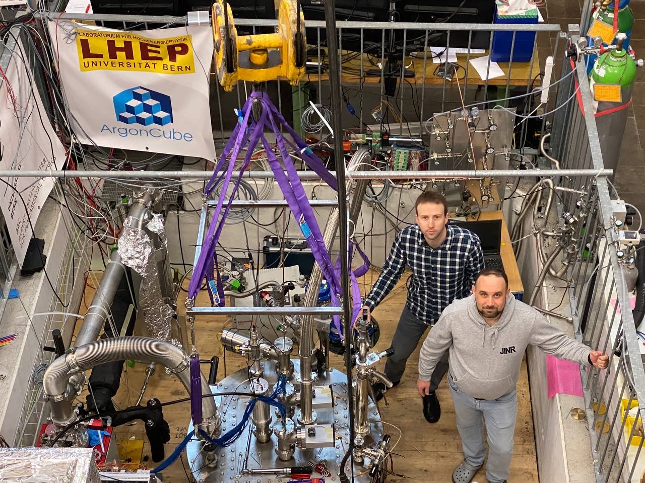 Nikolay Anfimov and Alexander Selyunin (DLNP JINR) at the University of Bern near time projection chamber module placed in cryostat. This module will be a part of ND-LAr prototype at Fermilab