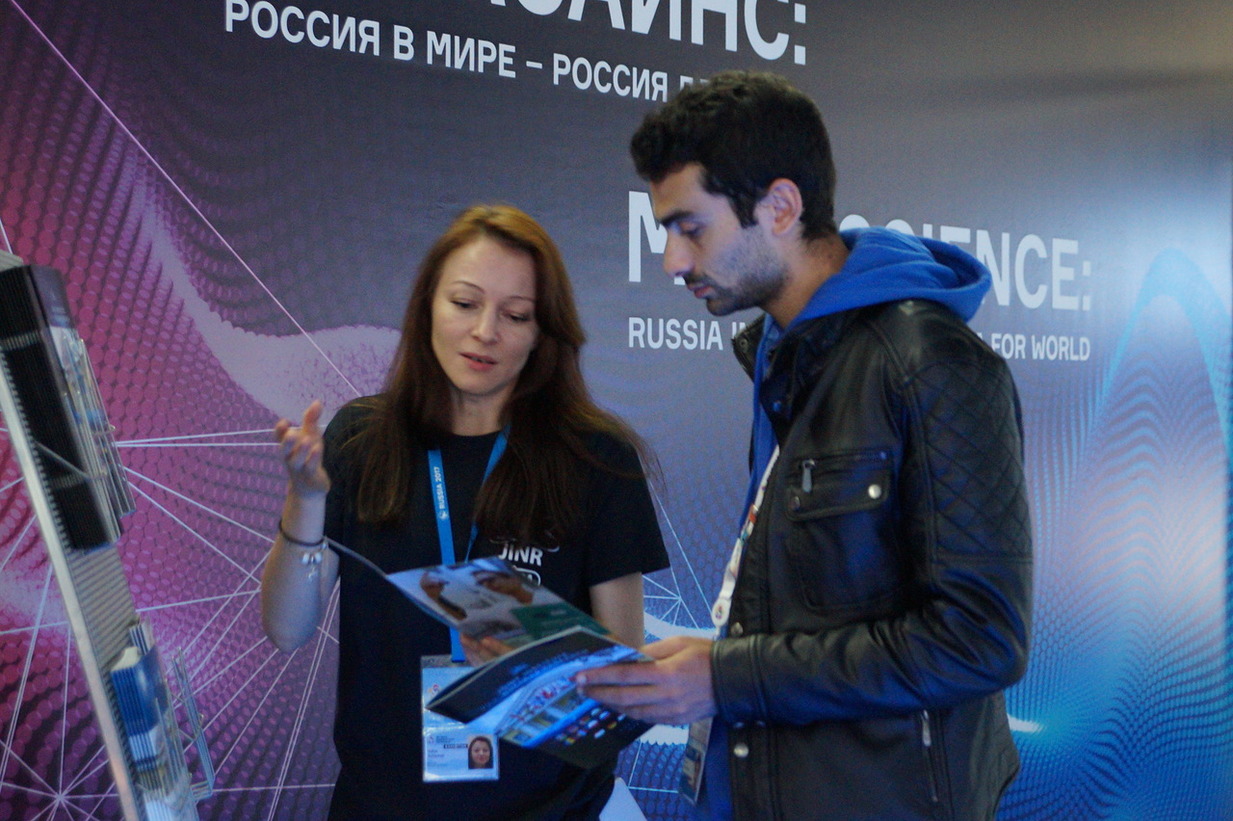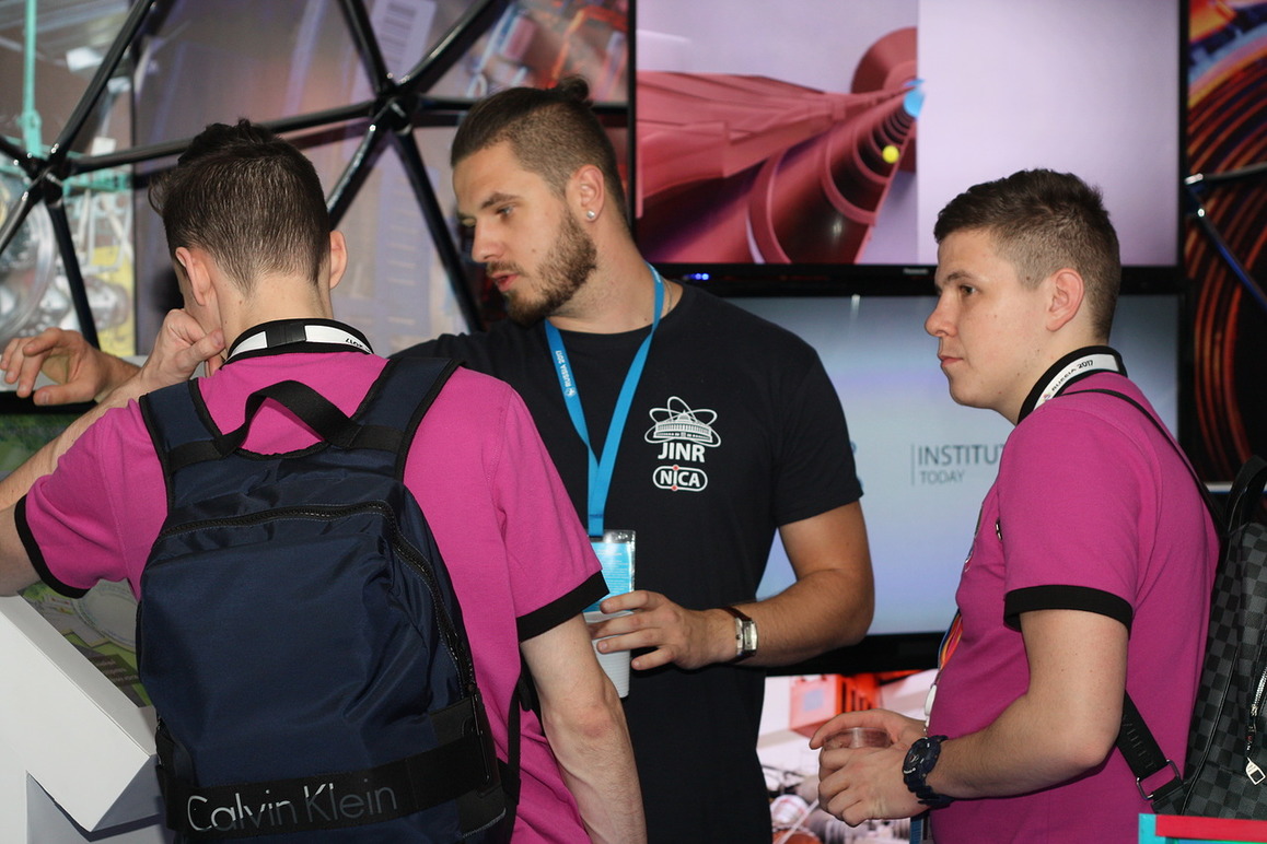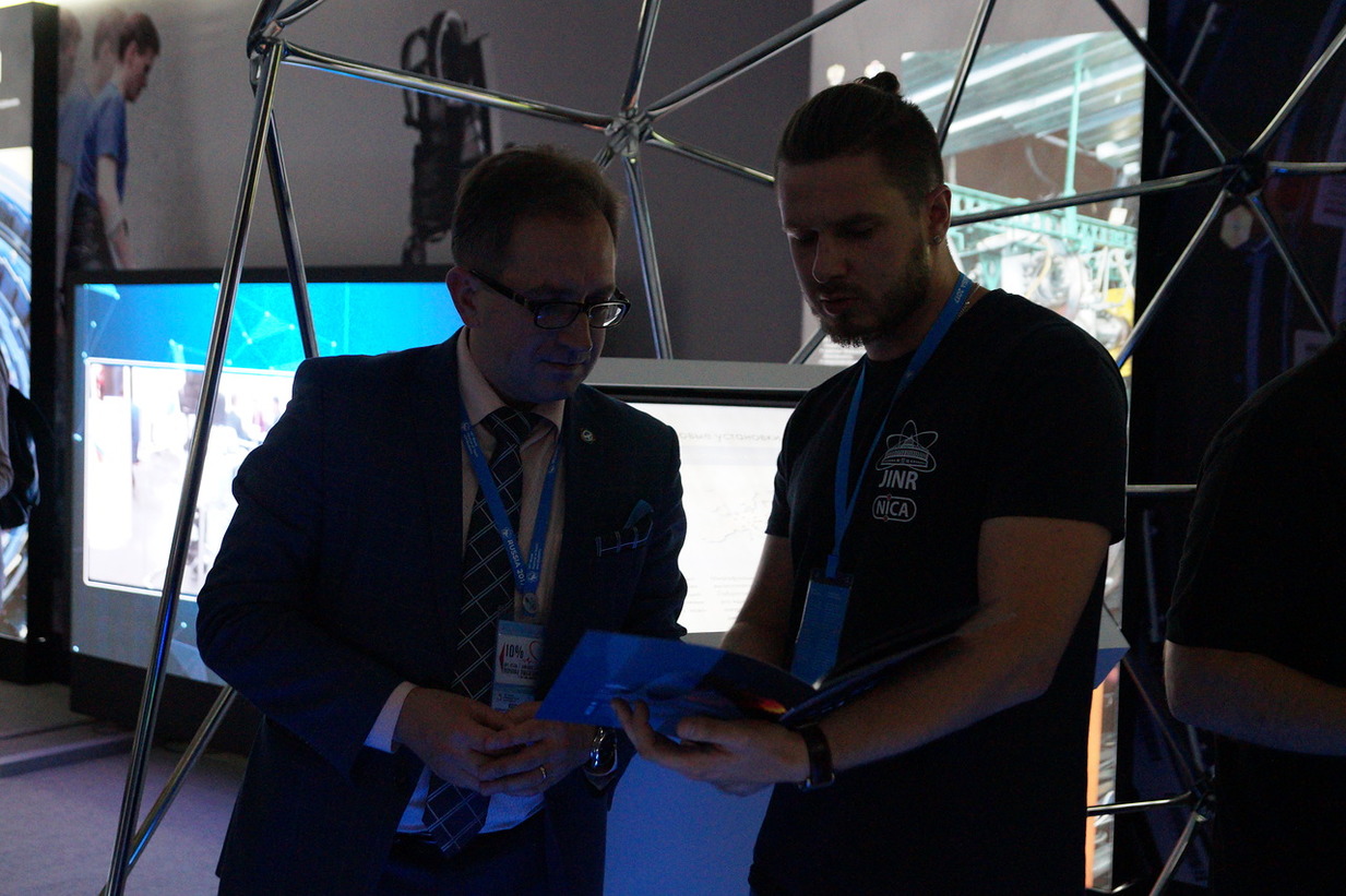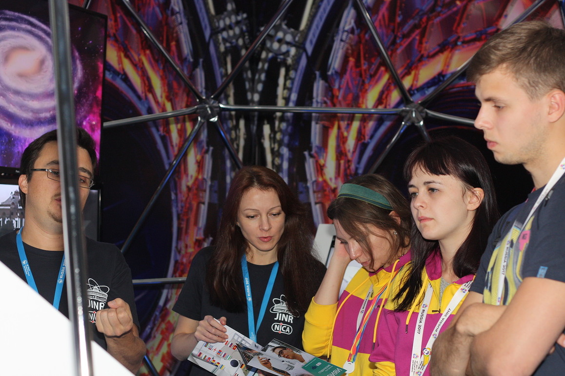 JINR participates actively in the exposition “Megascience: Russia in the World – Russia for the World”, where the Joint Institute for Nuclear Research presents its megascience flagship project – the accelerator complex NICA. Young JINR staff members, represented by Pavel Batyuk (VBLHEP), Boyana Dabrovska (VBLHEP), Nikita Sidorov (VBLHEP), Krystian Roslon (VBLHEP) and Yulia Rybachuk (UC) personify the Institute’s slogan by uniting Poland, Bulgaria and Russia in their international team. In addition to the NICA project, JINR also presents its educational programmes and opportunities for undergraduate and postgraduate students. On the second day of the exhibition staff members of the Veksler and Baldin Laboratory of High Energy Physics JINR Anatoly Sidorin, Oleg Rogachev and Elena Khabarova joined the JINR team to participate in the exhibition.