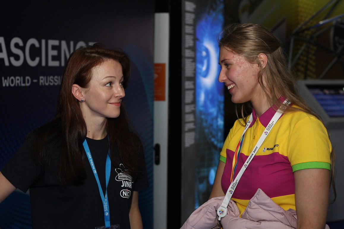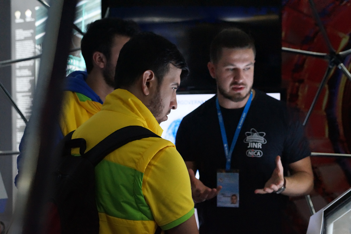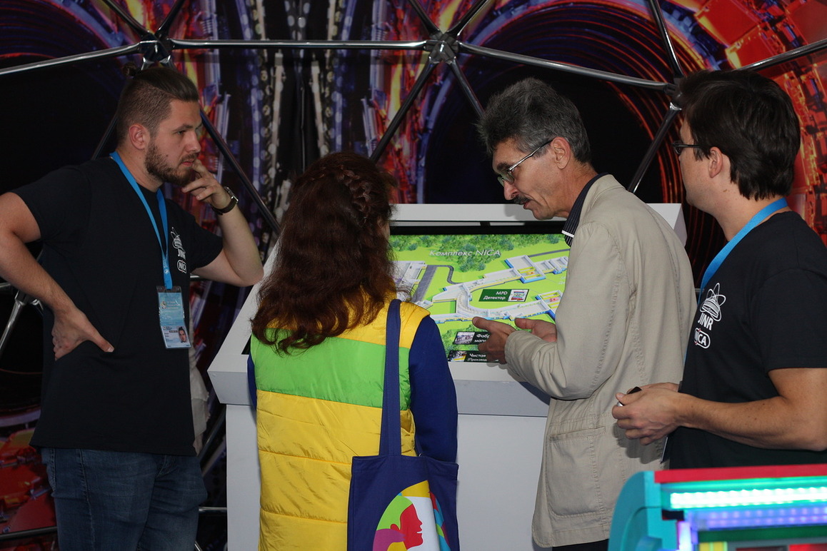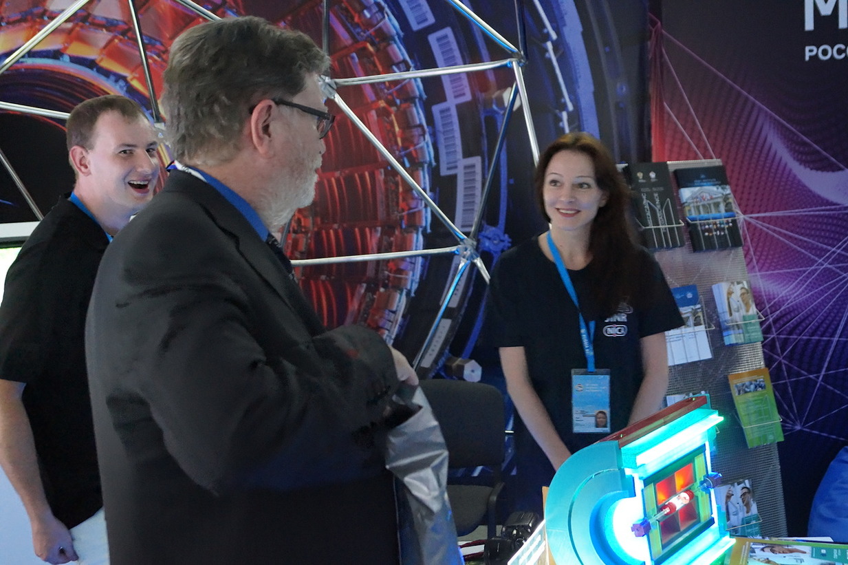 JINR participates actively in the exposition “Megascience: Russia in the World – Russia for the World”, where the Joint Institute for Nuclear Research presents its megascience flagship project – the accelerator complex NICA. Young JINR staff members, represented by Pavel Batyuk (VBLHEP), Boyana Dabrovska (VBLHEP), Nikita Sidorov (VBLHEP), Krystian Roslon (VBLHEP) and Yulia Rybachuk (UC) personify the Institute’s slogan by uniting Poland, Bulgaria and Russia in their international team. In addition to the NICA project, JINR also presents its educational programmes and opportunities for undergraduate and postgraduate students. On the second day of the exhibition staff members of the Veksler and Baldin Laboratory of High Energy Physics JINR Anatoly Sidorin, Oleg Rogachev and Elena Khabarova joined the JINR team to participate in the exhibition.
