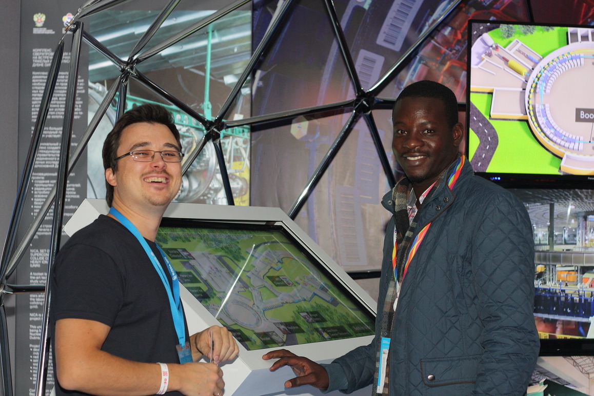Krystian Roslon presenting the NICA project to Deputy Minister of Education and Science of the Russian Federation Pavel Zenkovich
