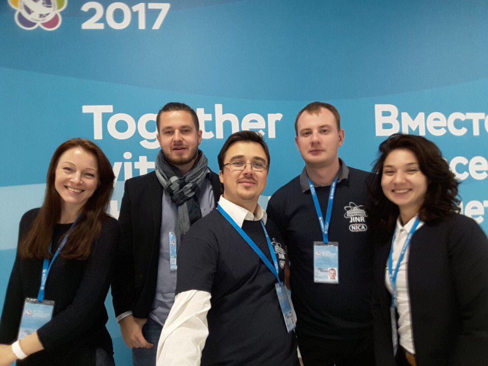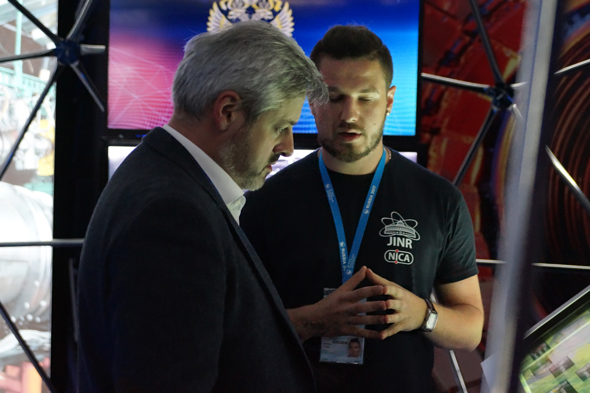 JINR participates actively in the exposition “Megascience: Russia in the World – Russia for the World”, where the Joint Institute for Nuclear Research presents its megascience flagship project – the accelerator complex NICA. Young JINR staff members, represented by Pavel Batyuk (VBLHEP), Boyana Dabrovska (VBLHEP), Nikita Sidorov (VBLHEP), Krystian Roslon (VBLHEP) and Yulia Rybachuk (UC) personify the Institute’s slogan by uniting Poland, Bulgaria and Russia in their international team. In addition to the NICA project, JINR also presents its educational programmes and opportunities for undergraduate and postgraduate students. On the second day of the exhibition staff members of the Veksler and Baldin Laboratory of High Energy Physics JINR Anatoly Sidorin, Oleg Rogachev and Elena Khabarova joined the JINR team to participate in the exhibition.