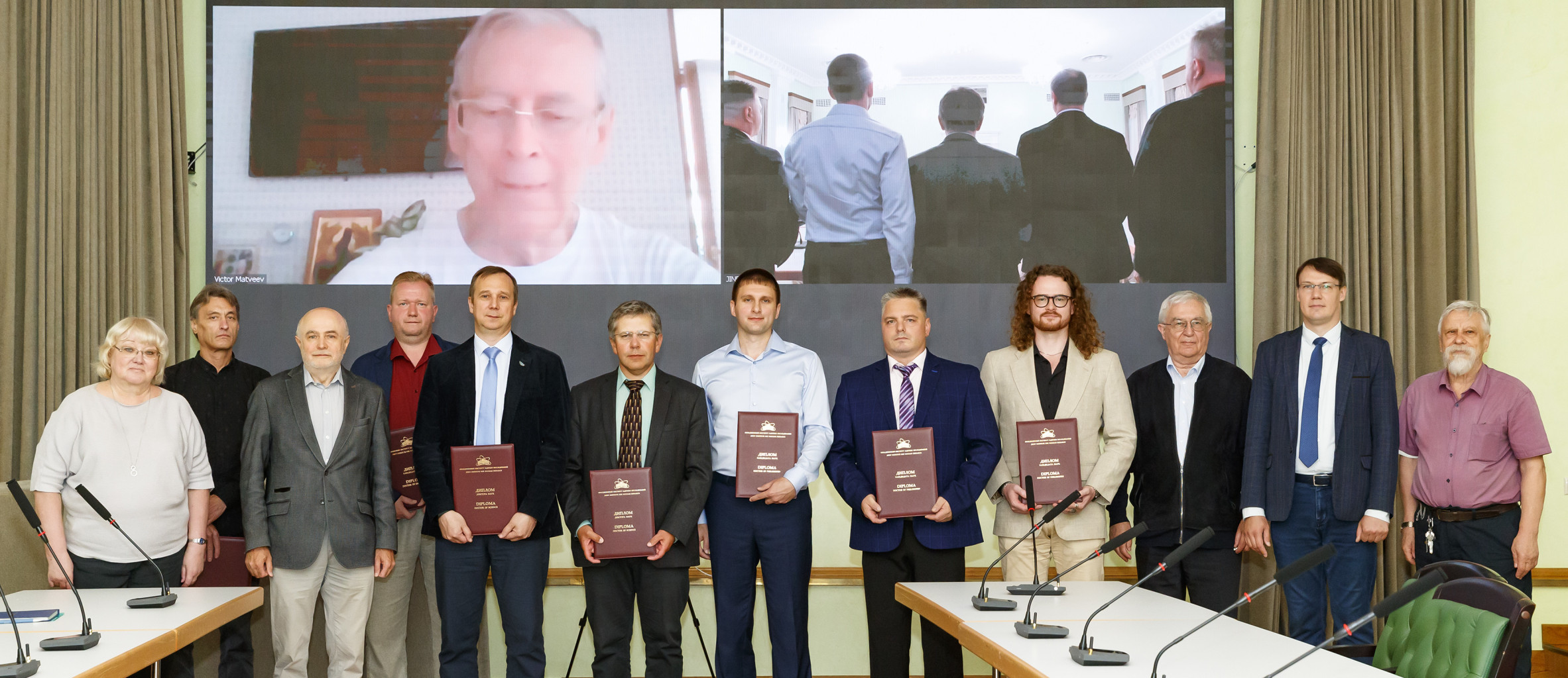 On 26 July, an awarding ceremony of diplomas on conferring academic degrees took place in the Big Hall of the JINR Scientists’ Club. Two Doctors of Sciences and five Candidates of Sciences received their diplomas. By tradition, the event was held in a festive atmosphere with the participation of representatives of the JINR Qualification Committee, guests, and scientific secretaries of Dissertation Councils, at meetings of which the defences took place.