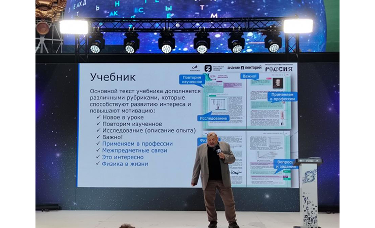 Head of the Department of Development of UC JINR Educational Programmes Yuri Panebrattsev presented a new set of advanced physics textbooks for grades 7-9 entitled Physics. Engineers of the Future, created with the participation of JINR, MEPhI, and Rosatom. The set is included in the federal list of school textbooks and an expanded educational and methodological complex.
