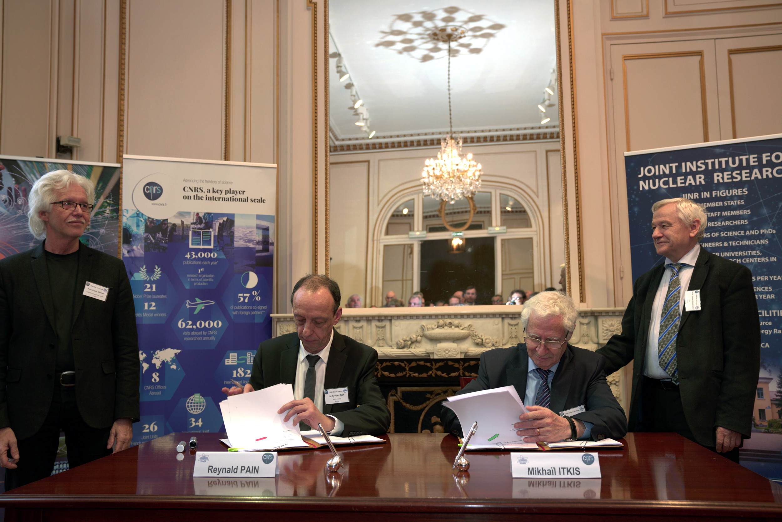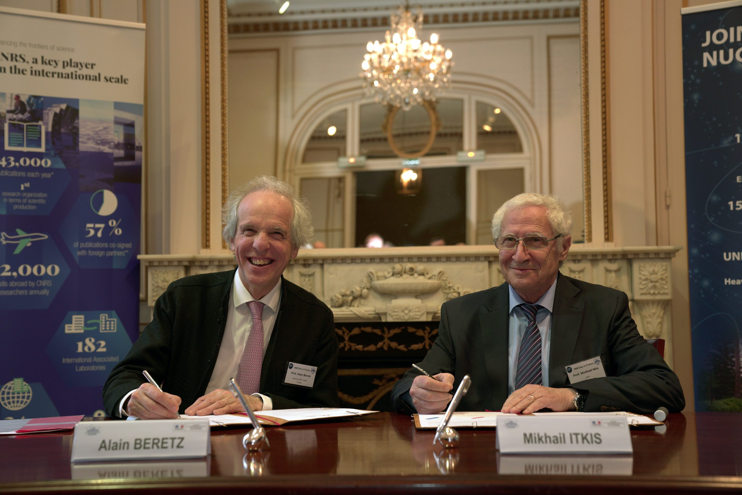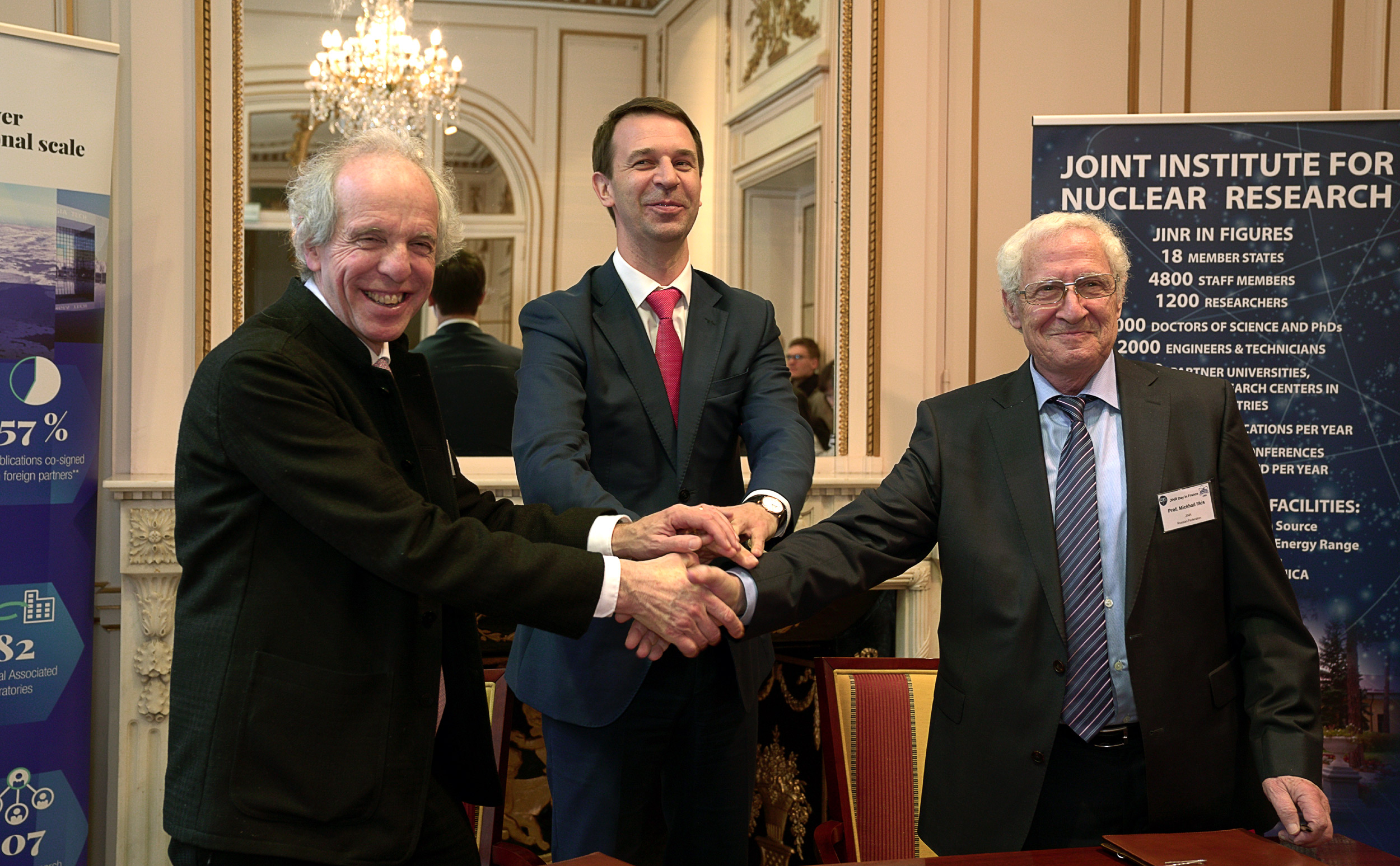 The meeting was organized by the National Centre for Scientific Research (CNRS) of France and took place in the Russian Centre for Science and Culture in Paris. More than 90 participants representing French scientific centres, universities and diplomatic missions of a number of the JINR Member States witnessed a great step forward to strengthening cooperation between France and JINR. A Letter of Intent was signed in the ceremonial atmosphere. The letter concerned signing a Memorandum of understanding by the French Government and the Joint Institute for Nuclear Research. The document reveals the parties’ intentions to make every effort to tackle all relevant organizational issues in a year. The document was signed by Director General for Research and Innovation of the Ministry for Higher Education, Research and Innovation (MESRI) of France Alain Beretz and JINR Vice-Director Mikhail Itkis.