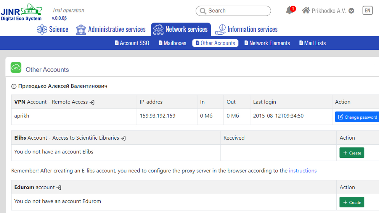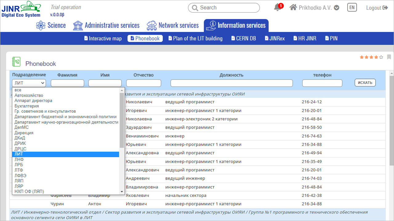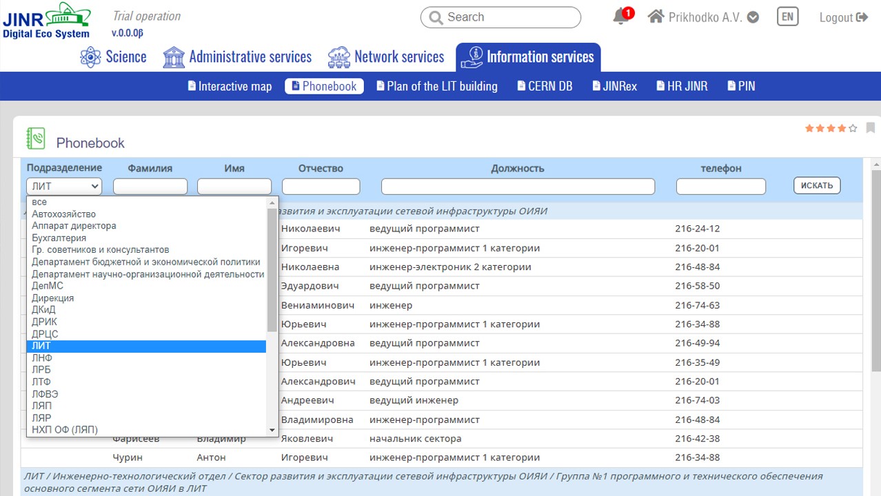 Now each JINR employee has several accounts in the systems in which he works. The Digital Ecosystem is a single window into them. Everything is collected in one place and available by one log-in: personnel, financial information, order for various administrative certificates. And this applies to general as well as scientific, administrative services. In the foreseeable future, this will significantly reduce the number of approvals and paperwork.