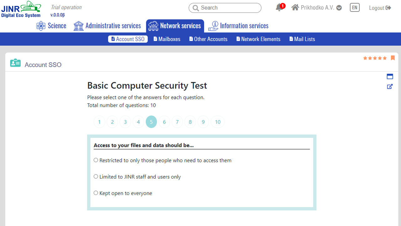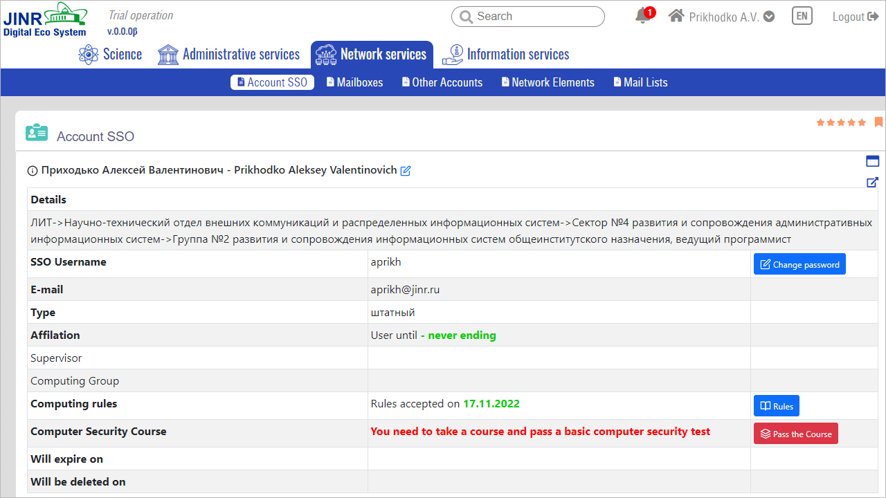 – Some of the services are available to everyone. JINR employees and associated personnel can use the full capabilities of the system. Each staff member receives a Single Sign-On (SSO) account. This account allows users to log into the JINR Digital Ecosystem. Ideally, once a user has registered, they should be able to get any information without going to the offices. There is still much to be done in order to implement this, but the first steps have been taken. We have set ourselves the goal of gradually solving all these tasks.