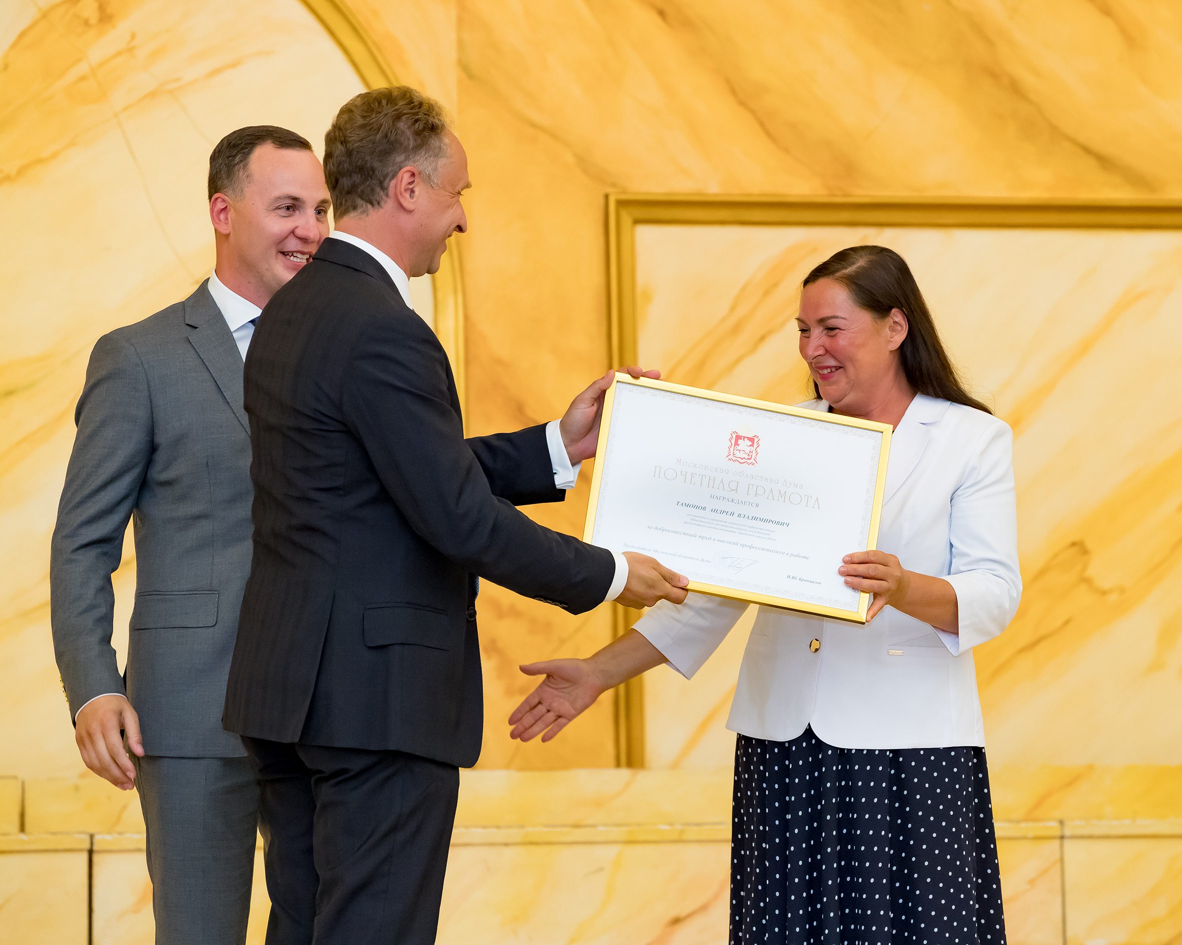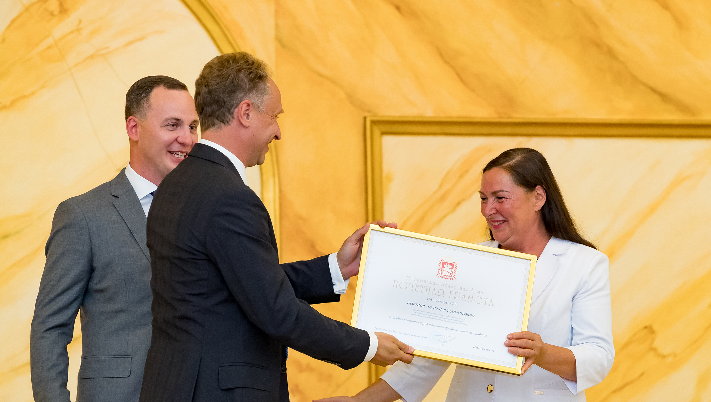 The honorary diploma of the Moscow Regional Duma was awarded to the head of the JINR Social Infrastructure Management Office, Chairman of the Dubna Council of Deputies Andrey Tamonov.