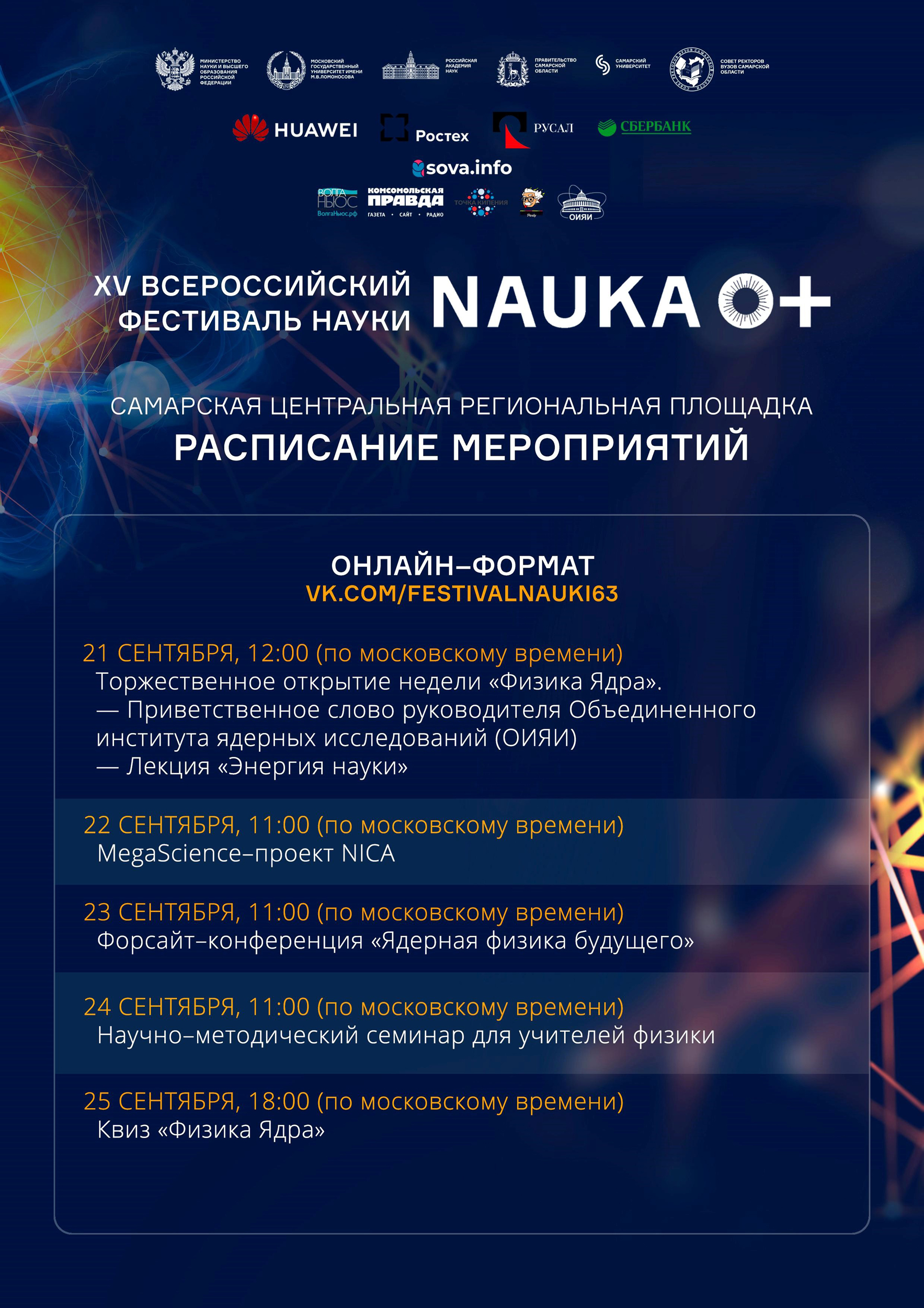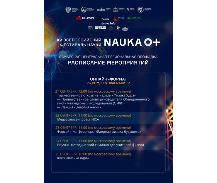 XV All-Russian Festival of Science “NAUKA 0+” opens up its virtual doors at one of the central regional sites of this year – in the Samara region. JINR will be an official representative of a thematic week “Nuclear Physics” in the frames of which the Institute will hold a series of science popular online events.