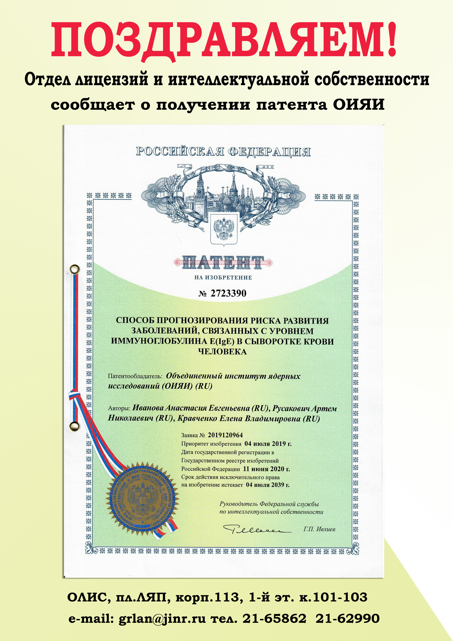 The Licensing and Intellectual Property Department of JINR announces that on 11 June 2020, the Joint Institute for Nuclear Research received a patent for the invention “Method for prediction of risk of developing diseases associated with the level of immunoglobulin E(IgE) in human blood serum”. The authors of the work are Ivanova Anastasiya Evgenevna, Rusakovich Artem Nikolaevich, Kravchenko Elena Vladimirovna.