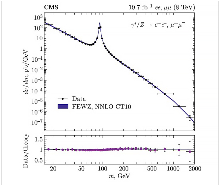 For the first time, the muon pair production with large invariant masses in hadron collisions were observed in the late 1960s in experiments at the AGS synchrotron (Brookhaven National Laboratory, USA), aimed at searching for the mediators of the weak interactions. A theoretical description of this process was suggested independently by S. Drell and T.-M. Yan and V. A. Matveev, R. M. Muradyan, and A. N. Tavkhelidze. Subsequently, this mechanism, widely known as the Drell – Yan mechanism, was studied in detail in various experiments. This process is extremely important for the physics of hadron colliders, since the measurement of its characteristics is a critical test of the Standard Model, including in a new energy range. The experiments at the LHC make it possible to study the production of lepton pairs in the region of invariant masses up to several TeV, i.e., for the first time, to go beyond the TeV scale of interactions (Fig. 2). In addition to tasks related to verification of SM predictions, this process has been used for several decades as an important tool for searching for signals of new physics.