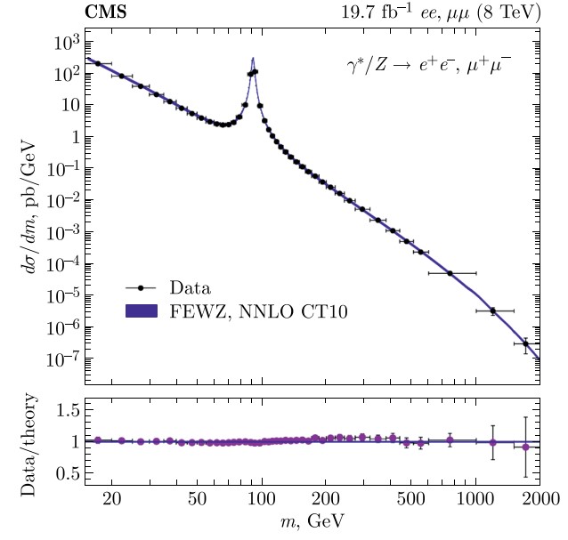 Fig. 3. The Drell-Yan differential cross section 1/σZ dσ/dm as measured in the combined dilepton channel (e+e− and μ+μ−). The ratio of experimental data and CM predictions in NNLO QCD and NLO EW is given. Calculations are made in FEWZ3.1 with PDF CT10