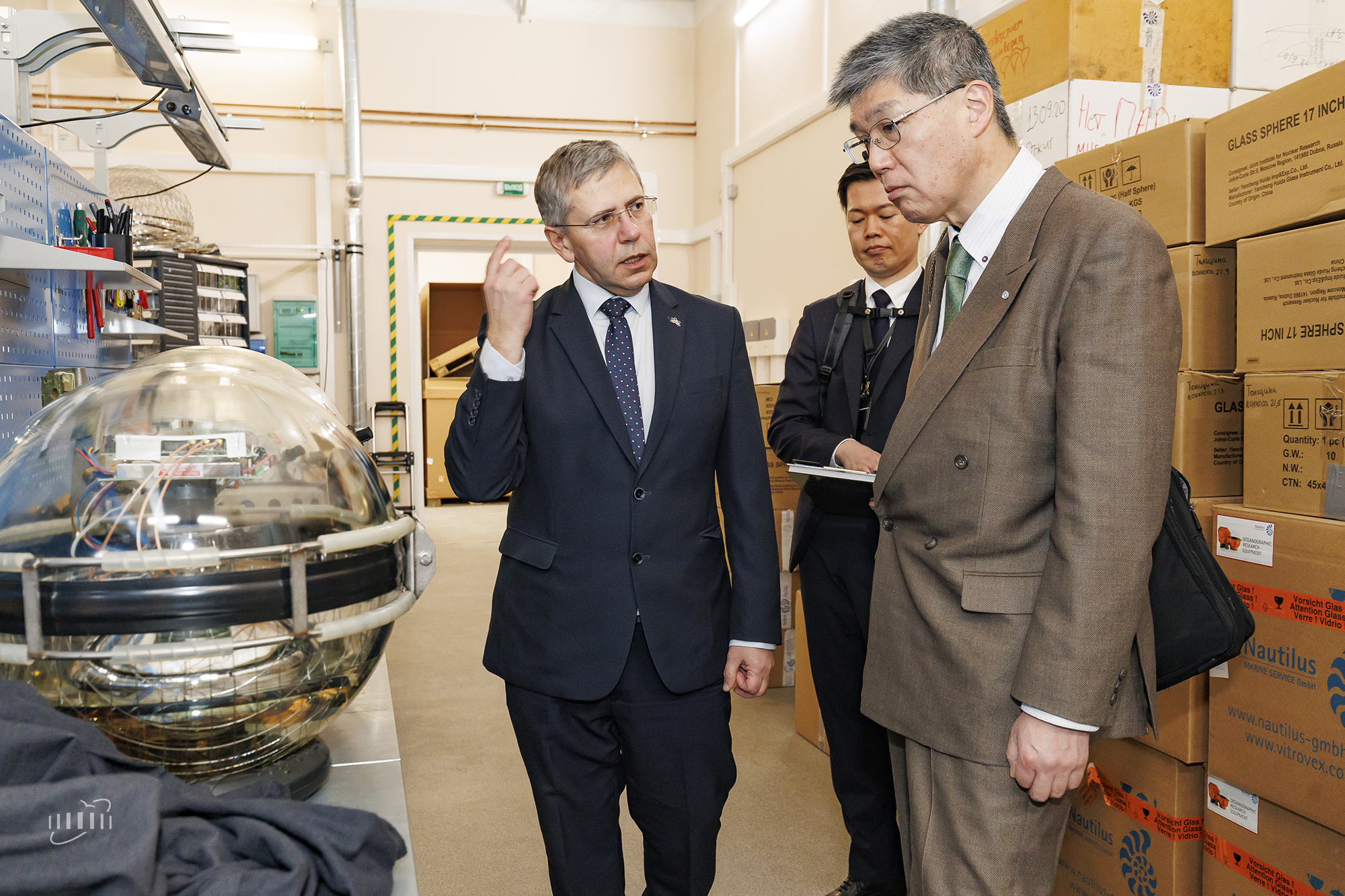 At a meeting with the Joint Institute’s leadership, Shoji Asai presented KEK’s extensive scientific programme, highlighting the unique capabilities of the SuperKEKB and J-PARC Research Facilities. In addition, he elaborated on flagship projects, describing the next-generation Hyper-Kamiokande Neutrino Experiment and the plans to construct its advanced intermediate detector, IWCD.
