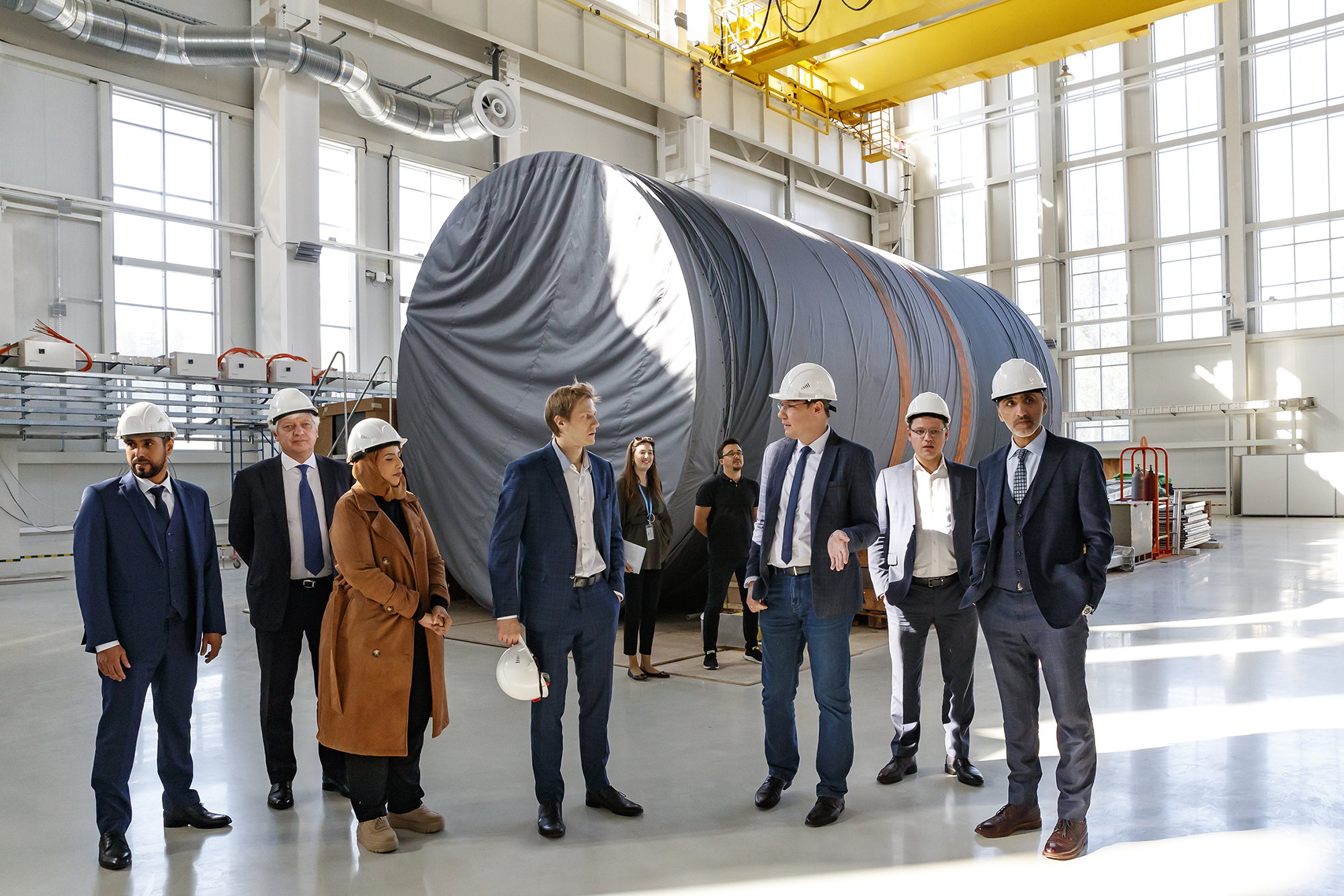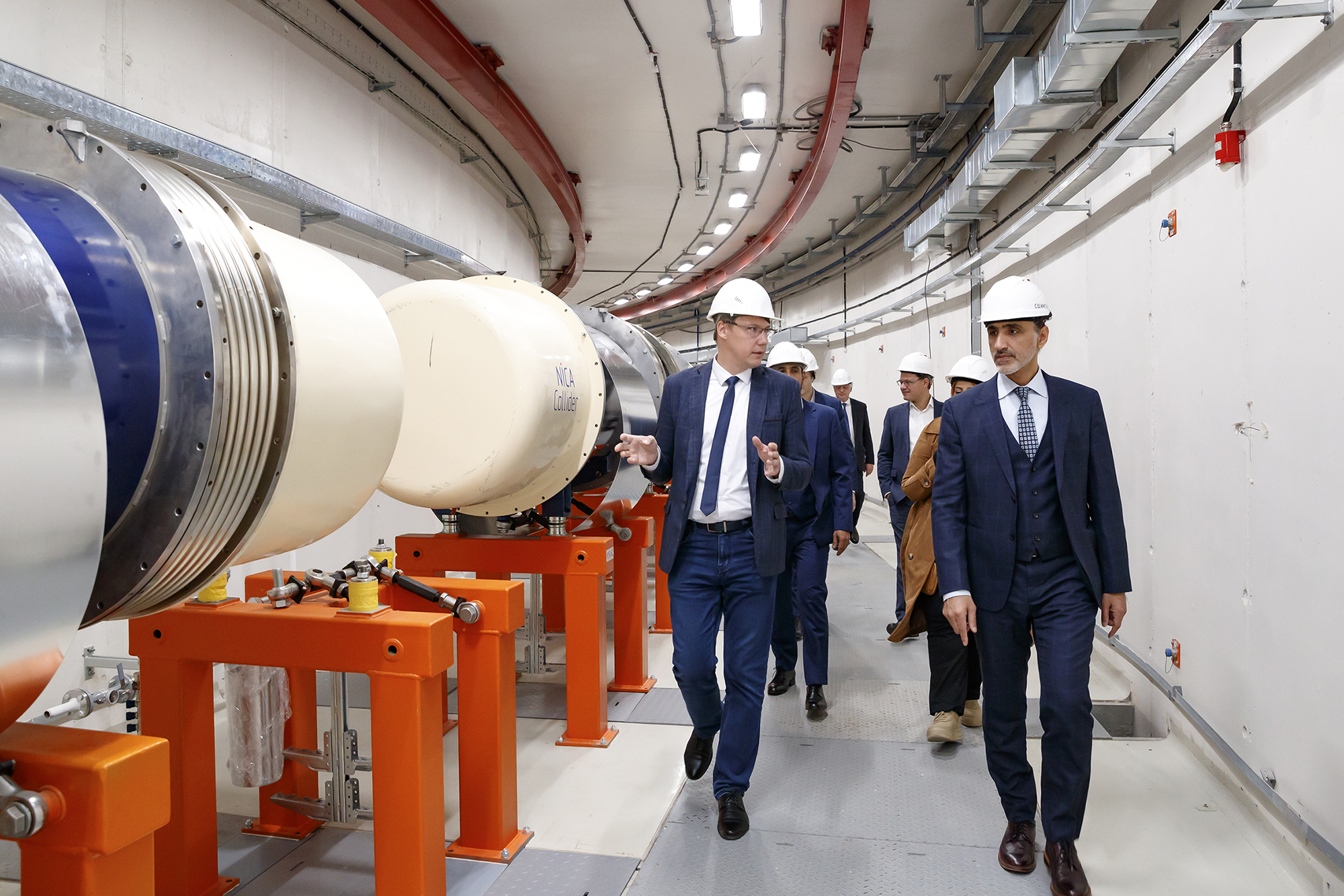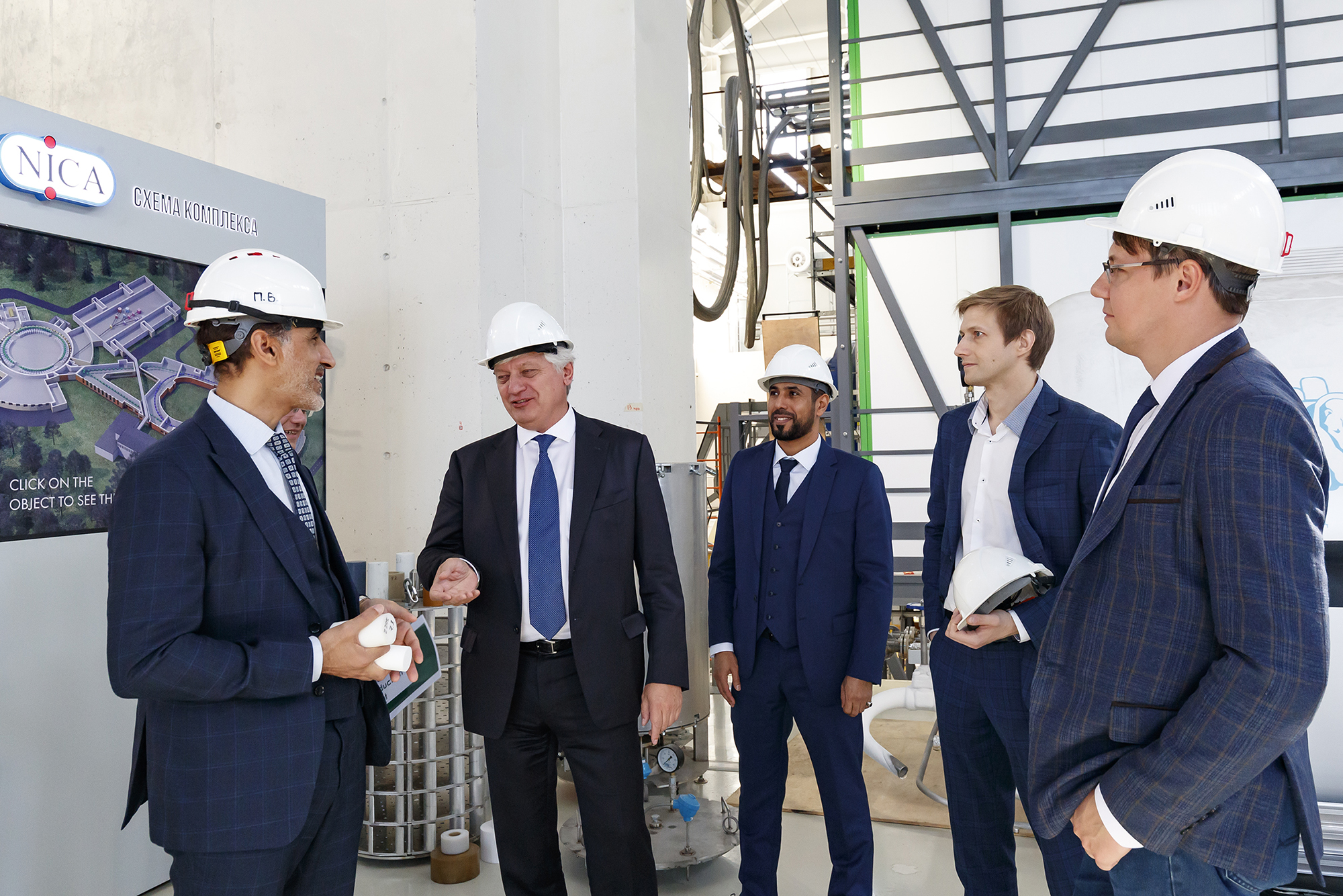 During the visit, members of the delegation toured the key facilities of the NICA Complex: the linear accelerator, the SOChI irradiation station, the Booster and the Nuclotron, the collider tunnel, and the MPD Detector hall. In the exhibition area of the hall a presentation of the cooperation opportunities of the ARIADNA Collaboration and Quantum R LLC in radiation modification and application of the Raflon innovative material took place. The representatives of the Omani side were particularly interested in the technologies of production and assembly of elements of the collider ring of the accelerator complex, which were described during the visit to the factory of superconducting magnets.