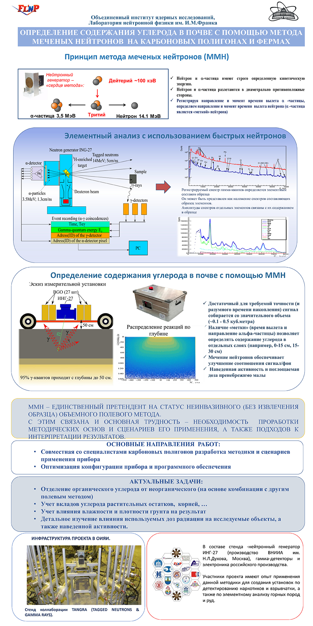 A non-invasive characteristic allows immediately obtaining information about the carbon content in a significant volume of soil at a certain depth. It is that feature to which the main difficulty is related. The method is very different from those used today. It is necessary to develop methodological framework and ways of its application, as well as approaches to the result interpretation. Participants of the TANGRA collaboration from FLNP, DLNP, VBLHEP, LRB, and a number of partner scientific centres in close cooperation with specialists of carbon test sites will solve these tasks together with the optimisation of TNM-based setup implementation.