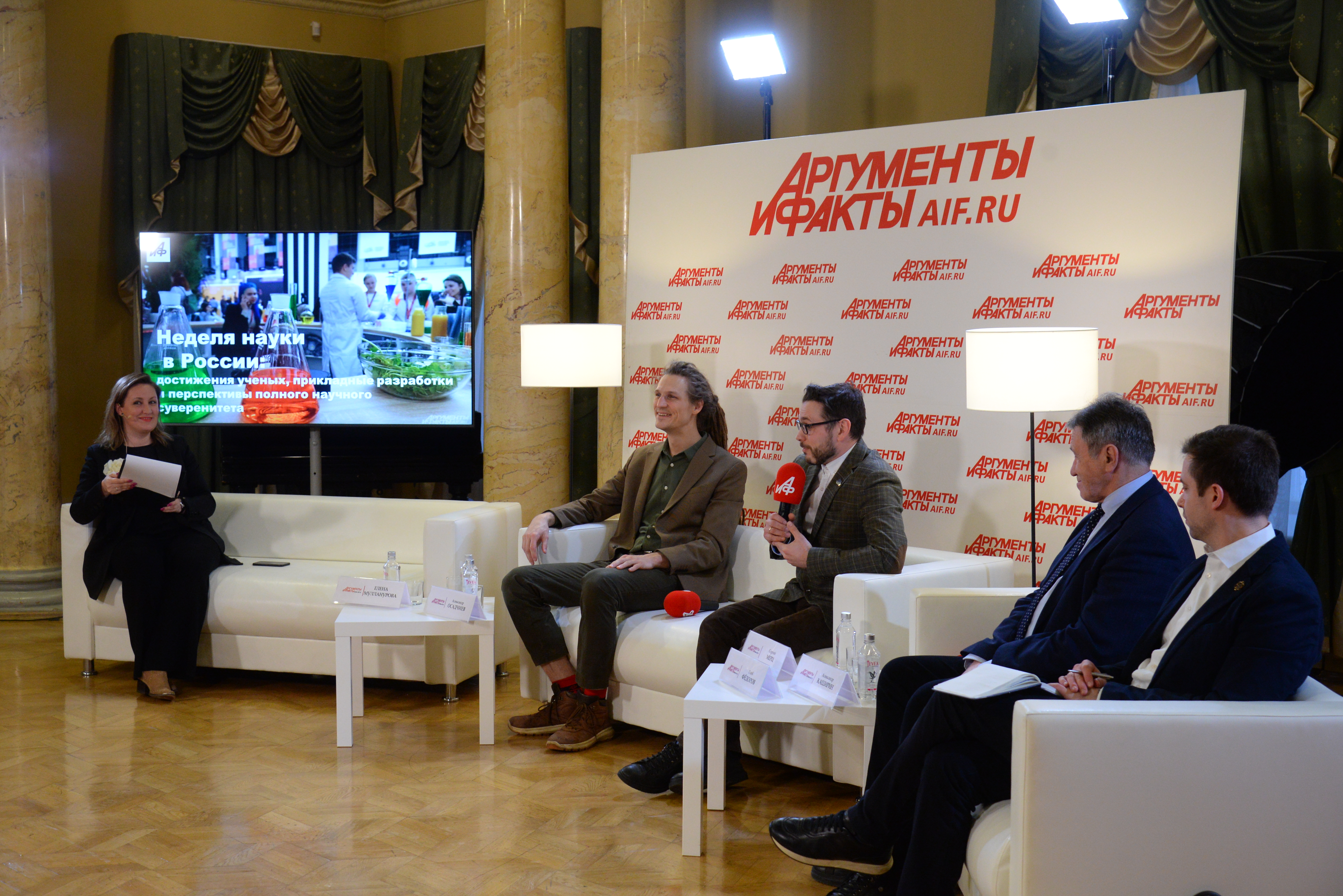 Participants of the round table were also a chief producer of ANO “National Priorities” Gleb Fedorov, Deputy Chairman of the Scientific and Technical Council of the Rostec State Corporation Alexander Kashirin, a winner of the 2022 Russian Presidential Prize in Science and Innovation for Young Scientists and leading researcher at the Institute of Oceanology Alexander Osadchiev. Together with the moderator of the meeting, Brand Director of the Argumenty i Fakty publishing house Elena Mullanurova, they discussed whether scientific sovereignty is possible in the modern world, considered successful practices of promoting science. The discussion was about advanced innovative development and applied research, building mutually beneficial relations between business and science, as well as the topics of reformatting research institutes into scientific clusters. Children from the children’s and youth association “Strength is in knowledge!” attended the meeting as well.