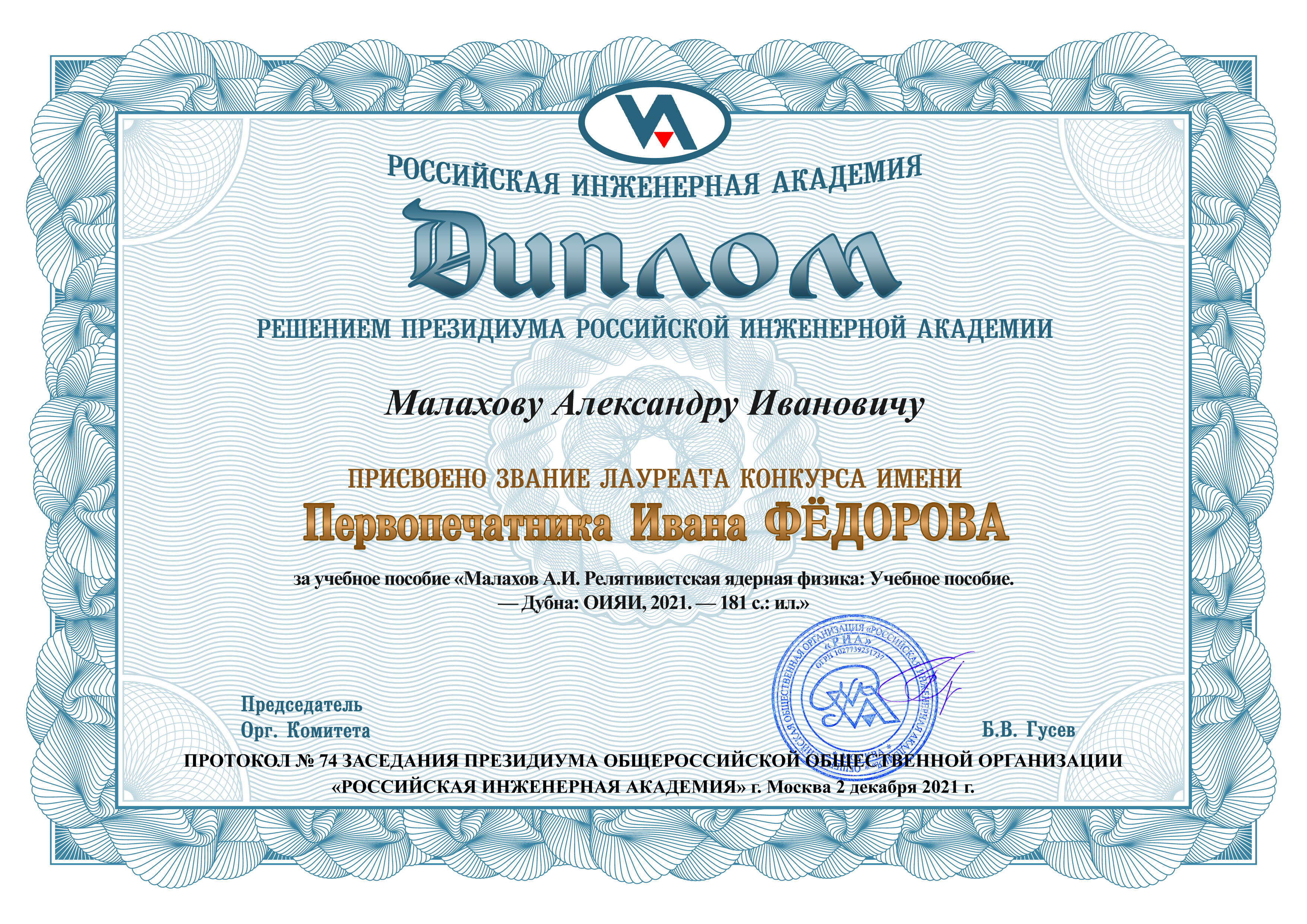 In December, at a meeting of the Presidium of the Russian Academy of Engineering, the results were announced of the All-Russian Competition named after the pioneer of printing Ivan Fedorov for the best scientific and methodical work. Professor Alexander Malakhov, a famous Russian physicist, Head of the Scientific and Experimental Department of Heavy Ion Physics of the Laboratory of High Energy Physics JINR, is among the laureates of the competition in 2021.