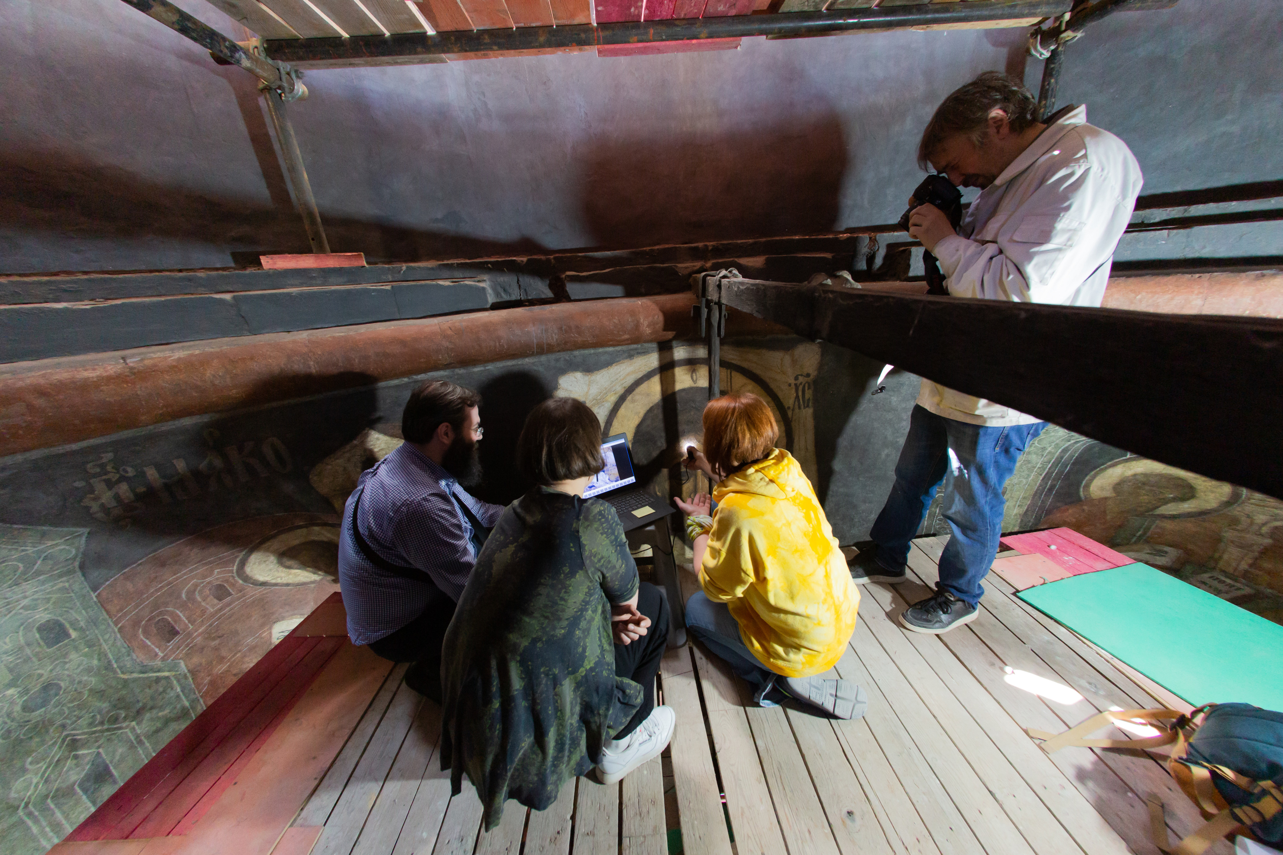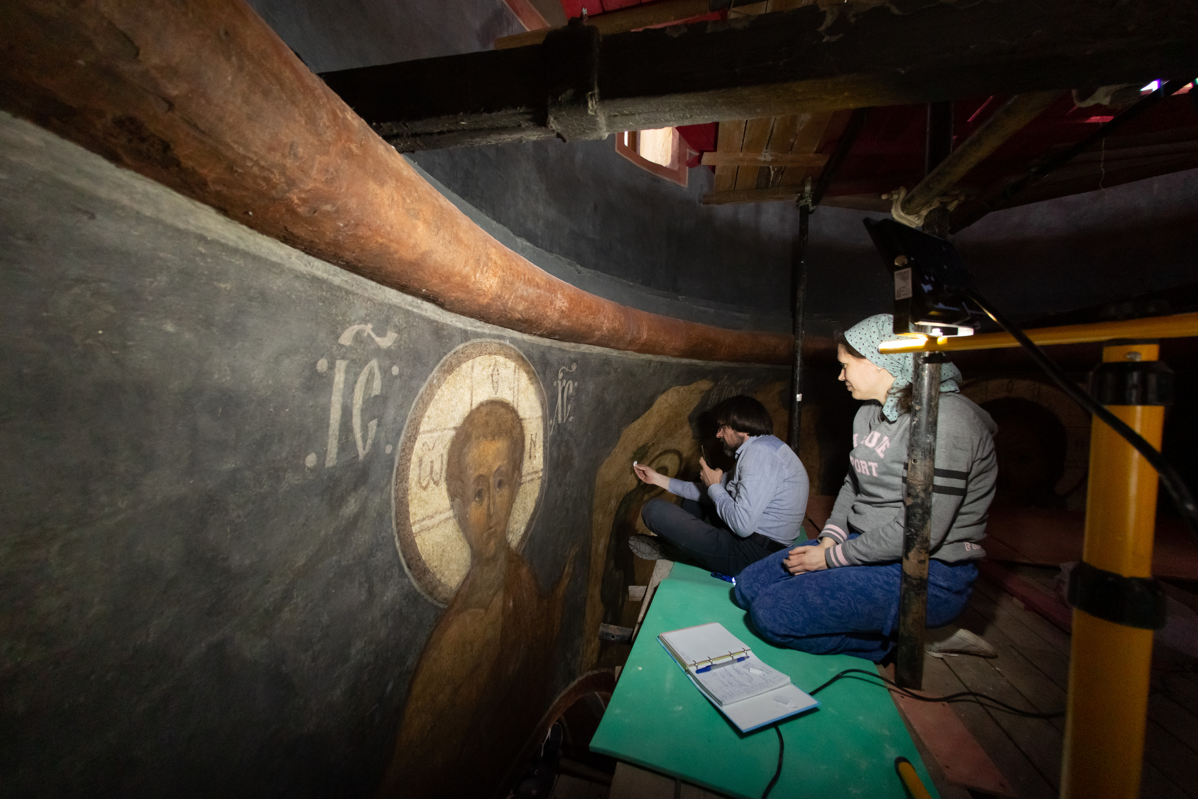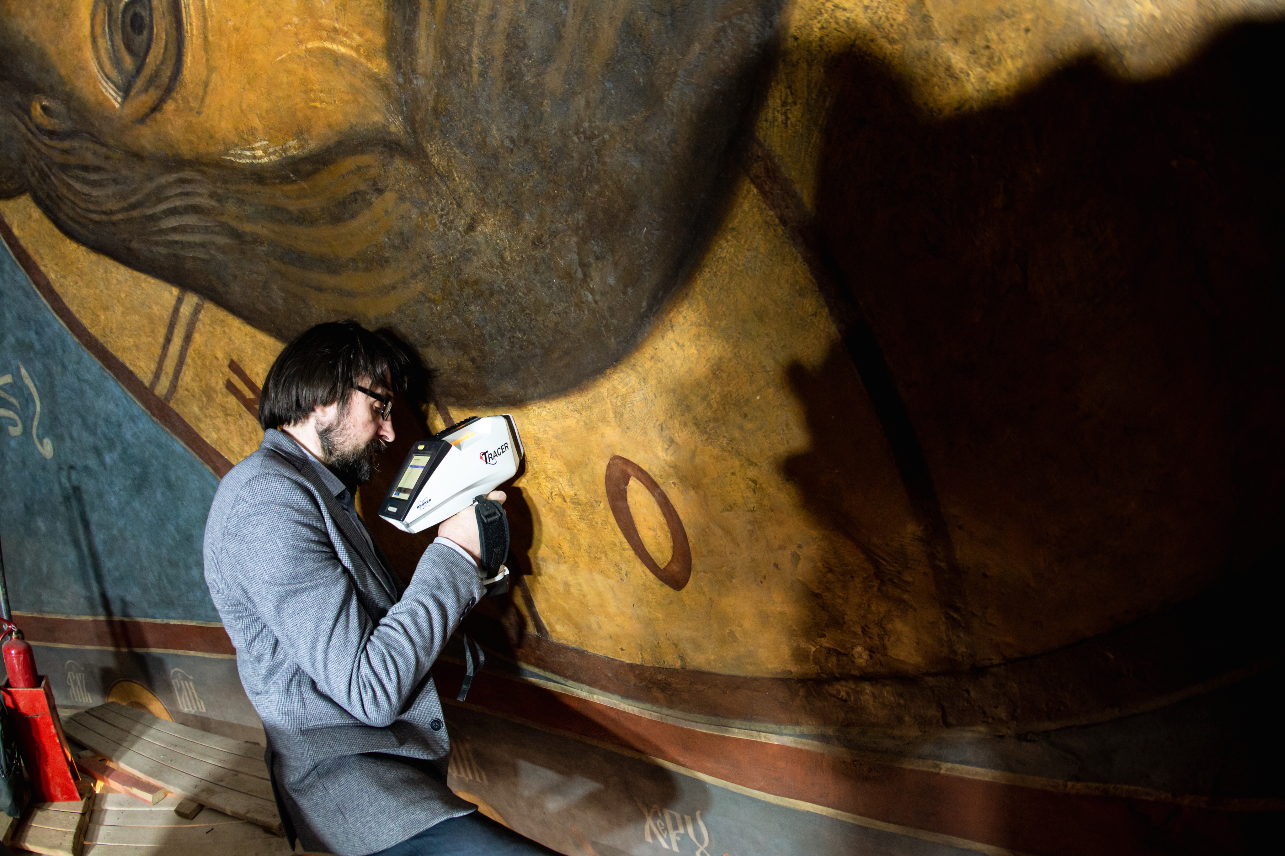 On 20 May, after soot had been removed from the walls, employees of the Group Candidate of Chemistry Olga Filippova and Candidate of Physics and Mathematics Andrey Dmitriev started in situ studies. “We have conducted in situ non-destructive elemental analysis using a portable device for X-Ray fluorescent analysis, measured the spectra in more than 120 spots, including in the tholobate of the cathedral,” Olga Filippova said.