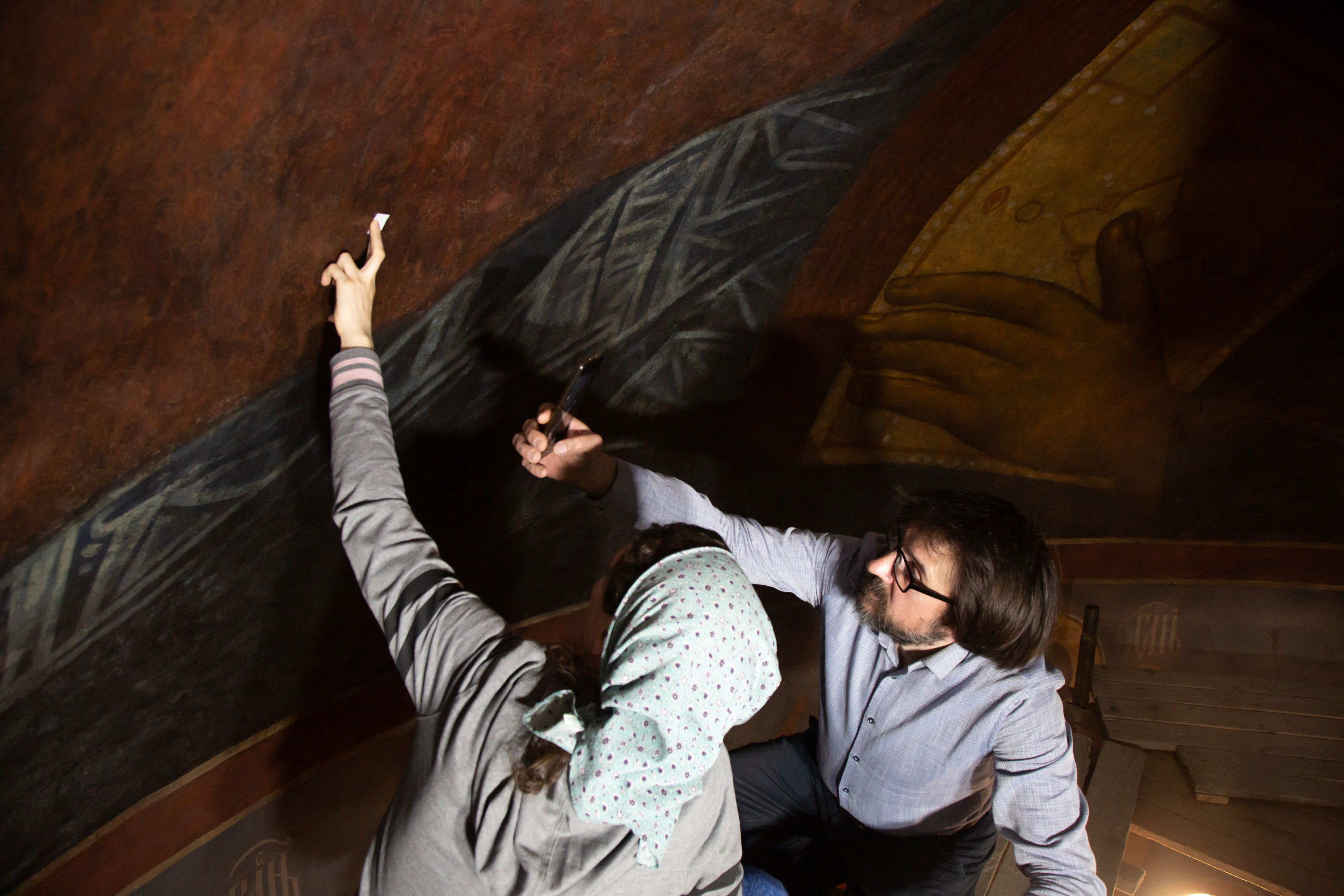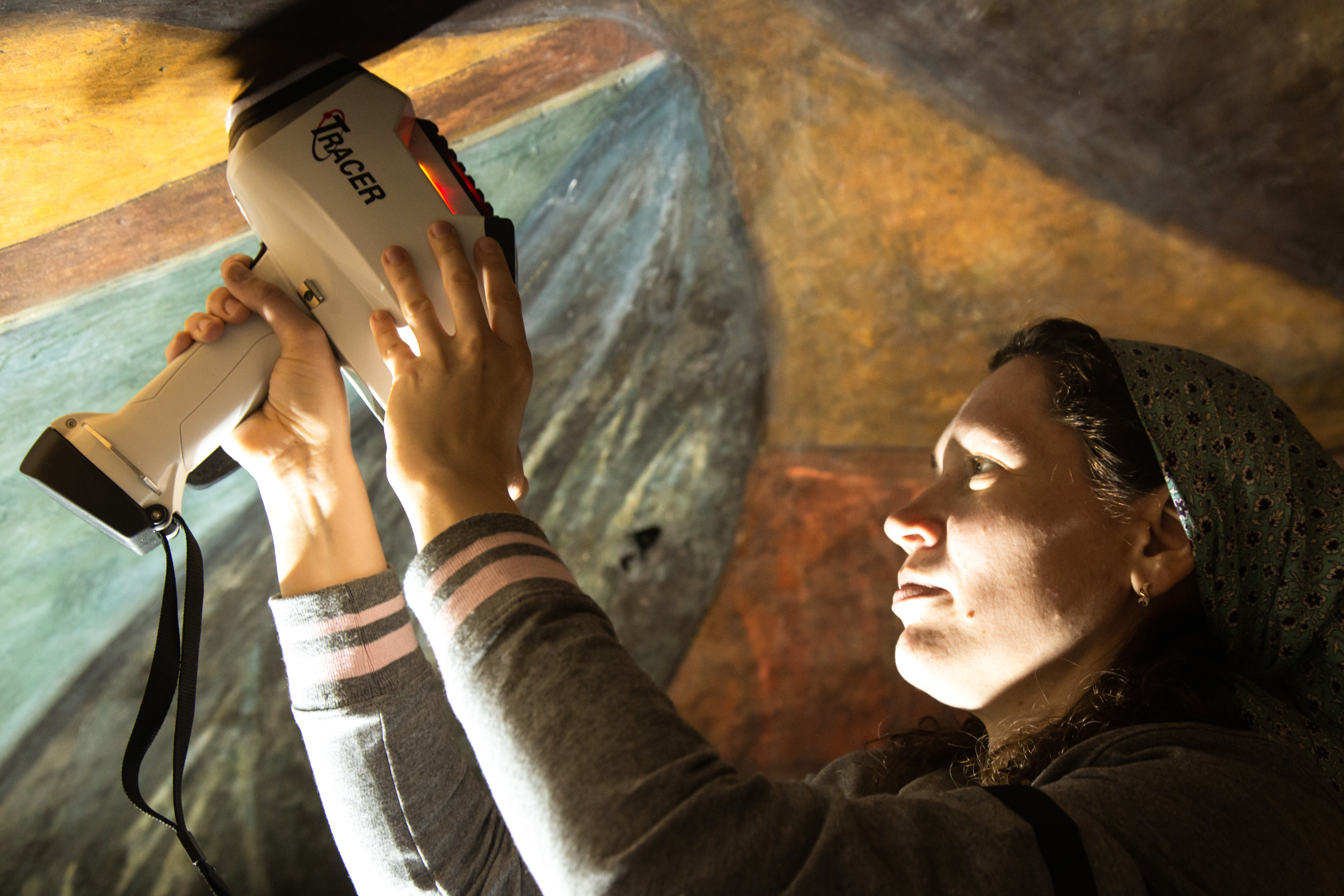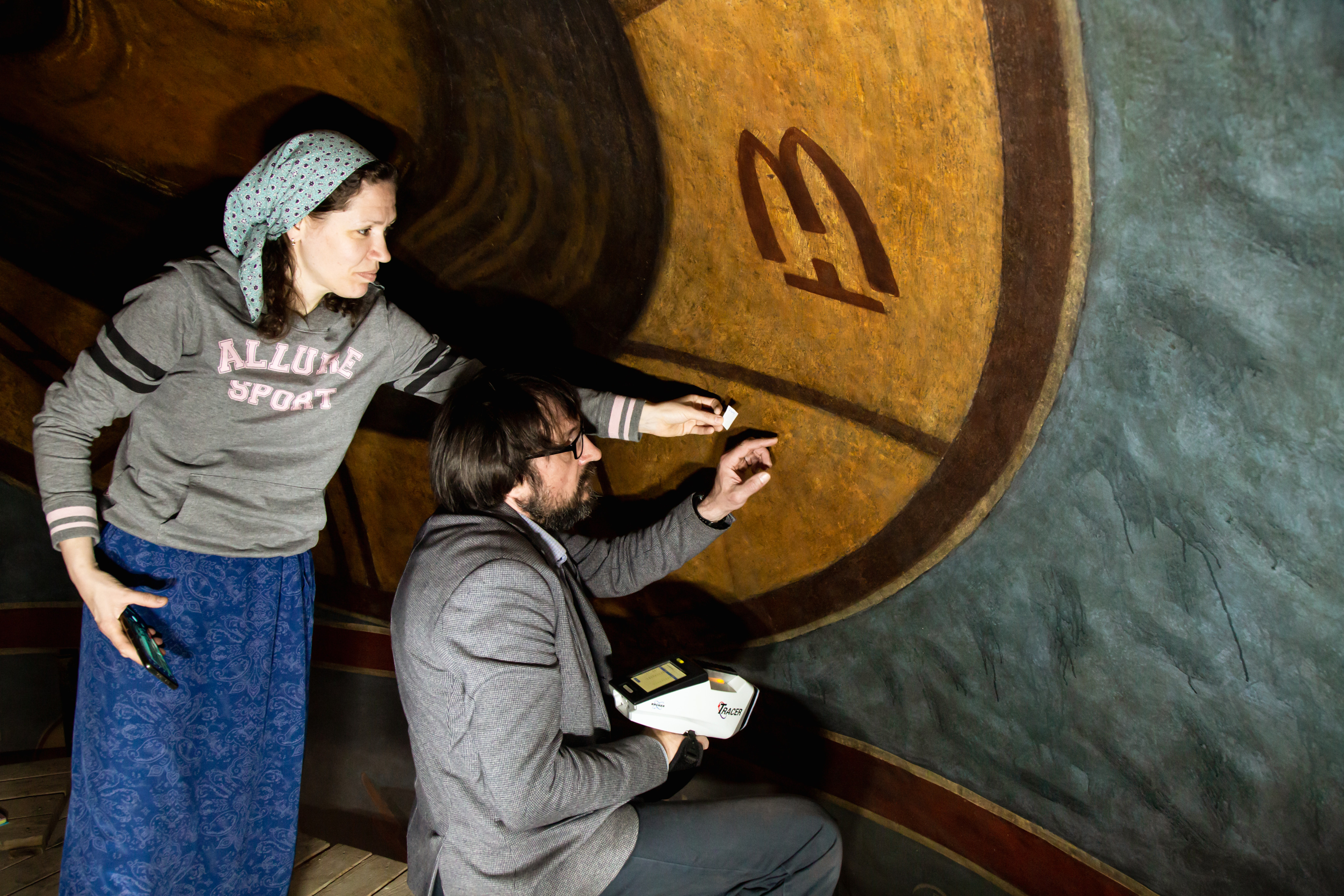 On 20 May, after soot had been removed from the walls, employees of the Group Candidate of Chemistry Olga Filippova and Candidate of Physics and Mathematics Andrey Dmitriev started in situ studies. “We have conducted in situ non-destructive elemental analysis using a portable device for X-Ray fluorescent analysis, measured the spectra in more than 120 spots, including in the tholobate of the cathedral,” Olga Filippova said.