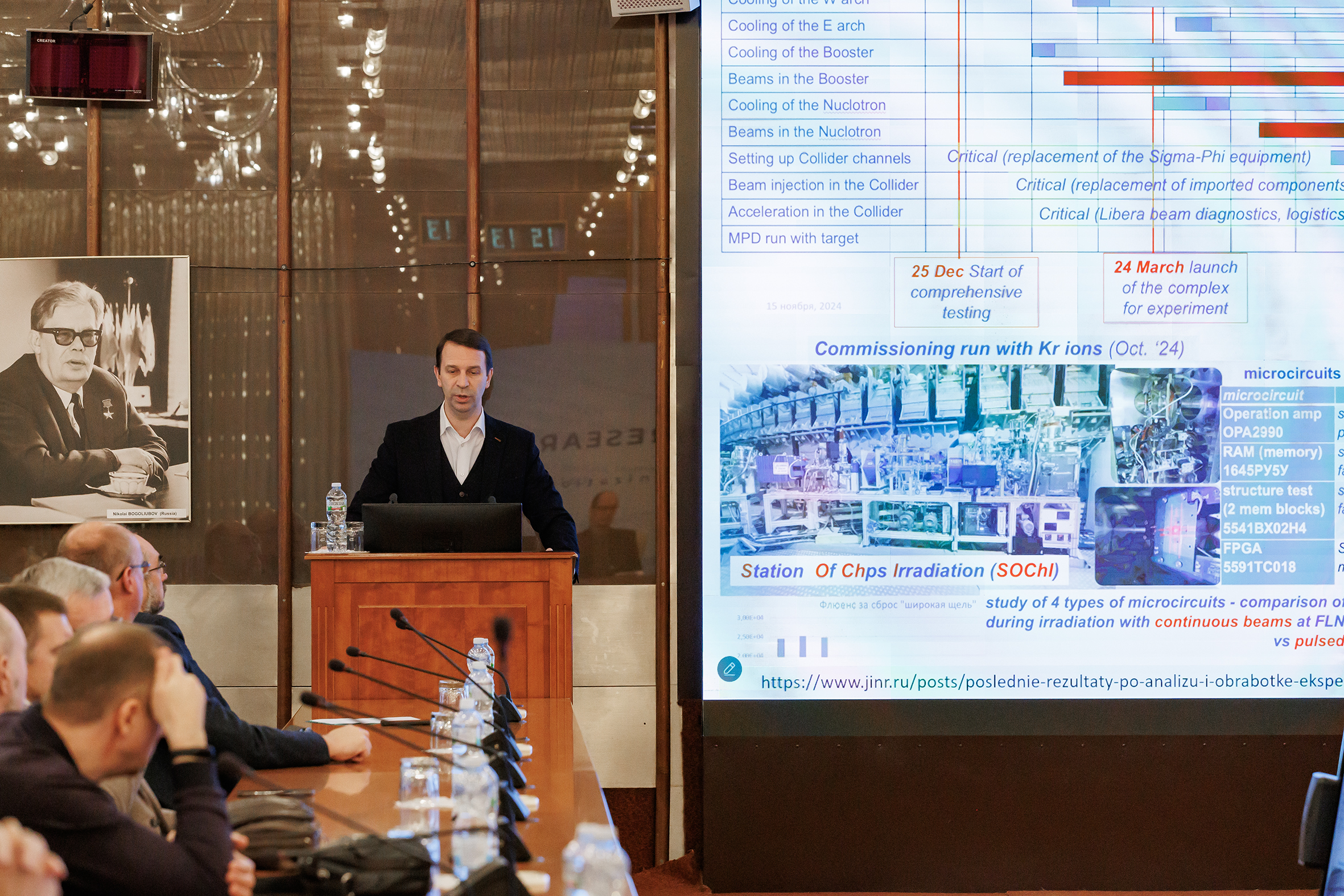 At the meeting of the Supervisory Board of the NICA Project, the phased commissioning schedule of the VBLHEP accelerator complex was presented. Employees of four Institute’s laboratories take part in the equipment installation and other preparatory work. “I would like to use this podium to thank FLNR, DLNP, and FLNP for joining the installation work with a huge amount of equipment on the collider ring,” Grigory Trubnikov commented.