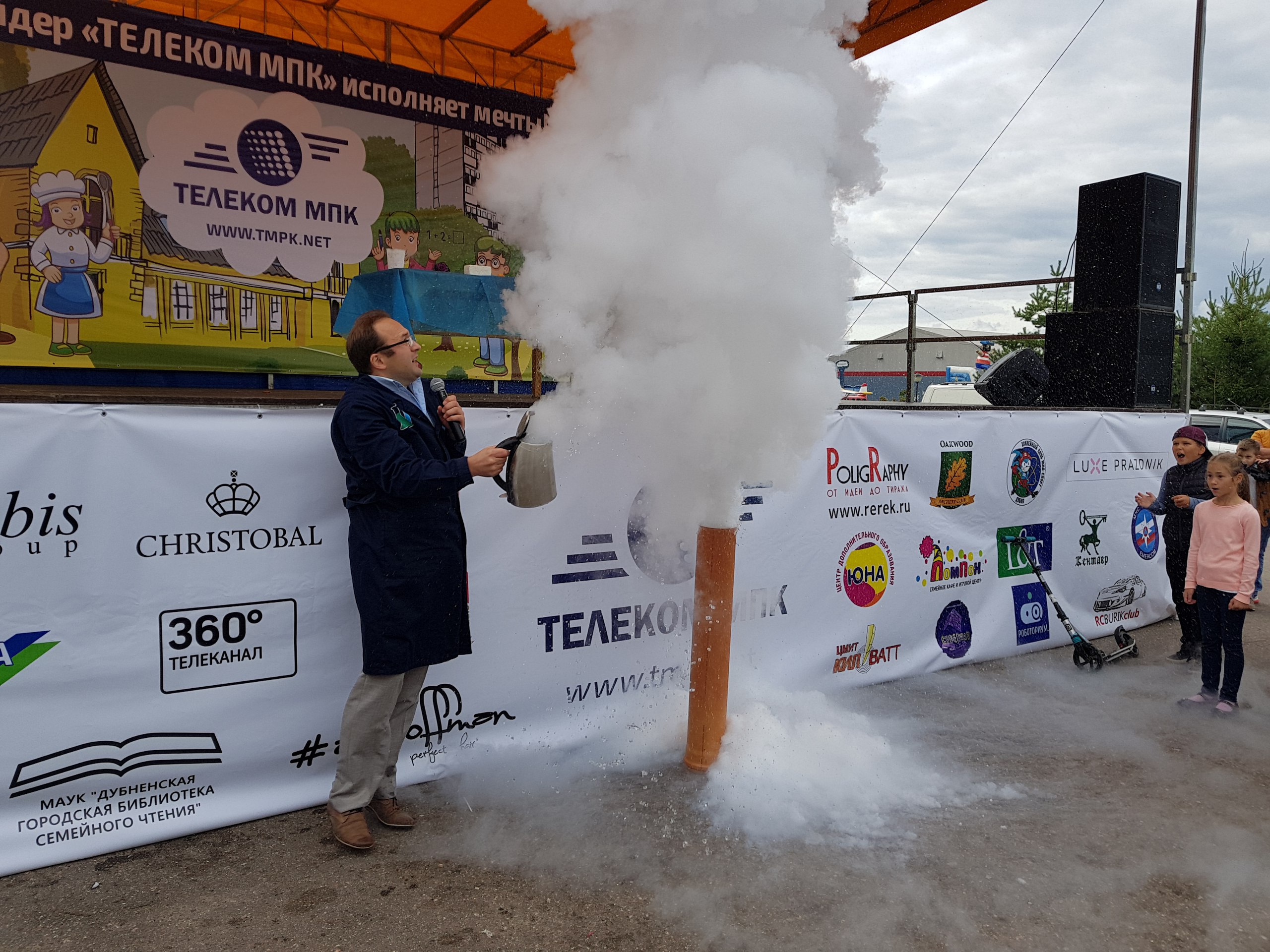 The JINR staff members presented spectacular and enlightening experiments with liquid nitrogen (levitation – the Meisner effect, explosions – extreme misting, the effect of low temperatures on different materials, the Leidenfrost effect, an experiment using the ideal gas law), other chemistry experiments (“the volcano”, “the spontaneous combustion”, “the Pharaoh’s snake” etc.), experiments connected with stable equilibrium, the centre of gravity and air pressure, and small lightning bolts produced with a Van de Graaff generator, etc.