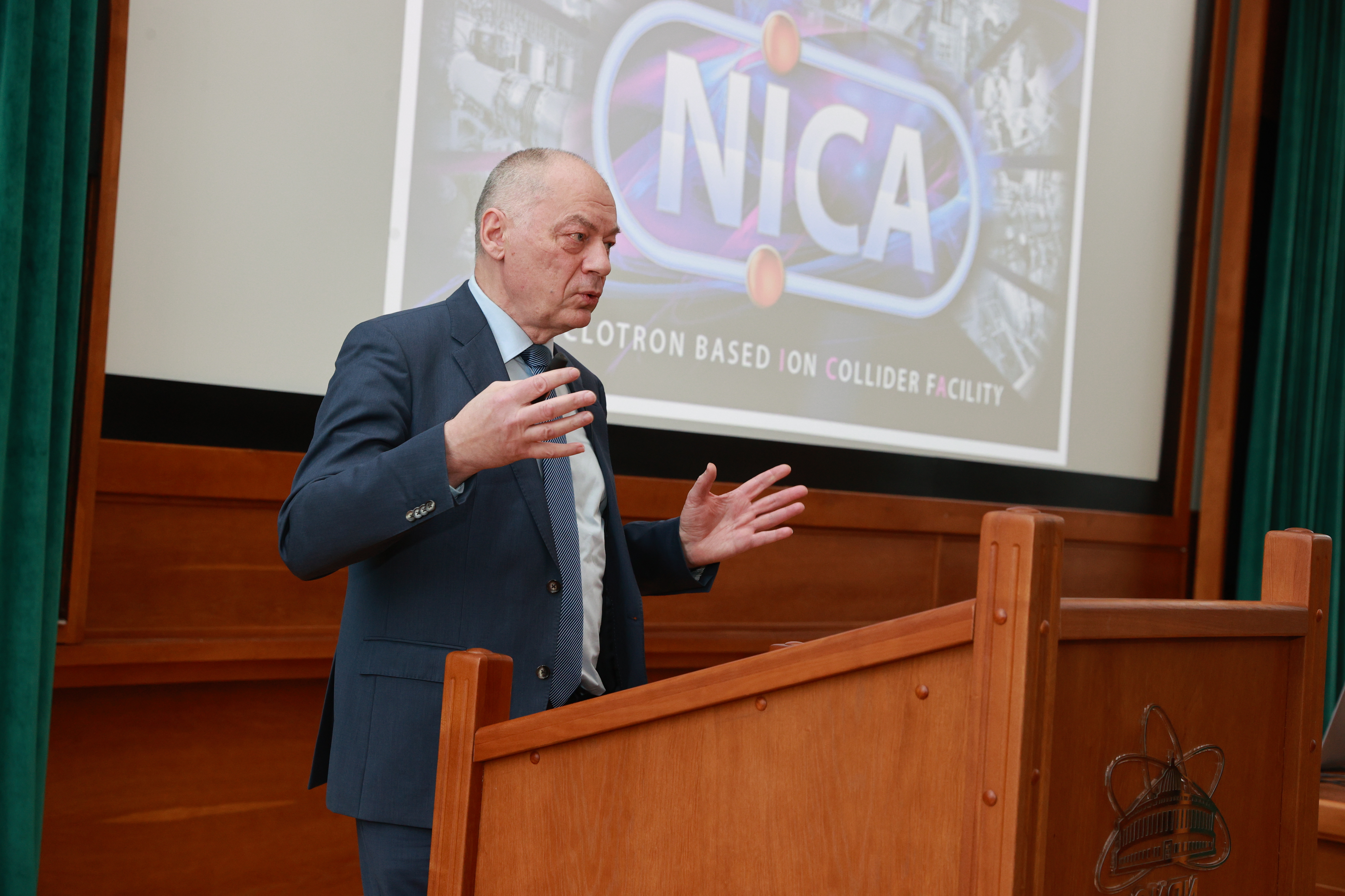 JINR Director Grigory Trubnikov delivered a congratulatory address on behalf of the JINR multinational team signed by representatives of 19 Member States. “Victor Anatolievich has held the JINR Director post for almost 10 years. Victor Matveev took up this office at a difficult time for the international centre. The Joint Institute has changed during the years of his leadership,” the JINR Director said in the congratulatory address. Some reports of the seminar dedicated to the NICA megascience project, the Baikal-GVD neutrino telescope, the “Govorun” supercomputer highlighted the development of the JINR scientific infrastructure during the leadership of Matveev. All these projects have significantly progressed thanks to the active and efficient support of Victor Matveev. It was emphasised that under the leadership of Academician Matveev at JINR, the budget of the Institute had increased several times and the approach to financing projects had changed, which also had a positive impact on the development of projects.