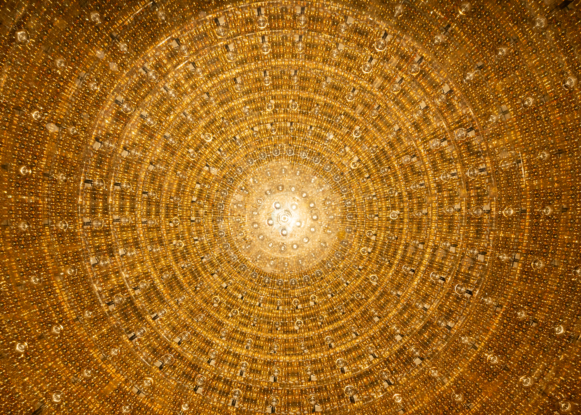 JUNO’s central detector before being filled up. The picture shows part of the outward-facing photomultipliers and the Earth’s magnetic field compensation coils. Photo: Yuexiang Liu