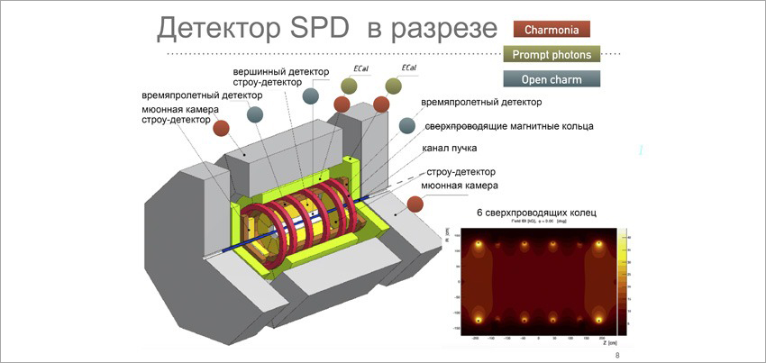 В самом центре конструкции, похожей на восьмигранную бочку, проходит канал коллайдера NICA, где в вакууме мчатся ускоренные частицы. В этом канале внутри детектора SPD происходит столкновение двух пучков ускоренных частиц, которые движутся в кольцах коллайдера во встречных направлениях. Два кольца коллайдера пересекаются как раз внутри детектора SPD, чтобы именно здесь, под присмотром специальных приборов, столкнуть встречные пучки и изучить новые частицы, которые образуются в результате столкновения пучков.