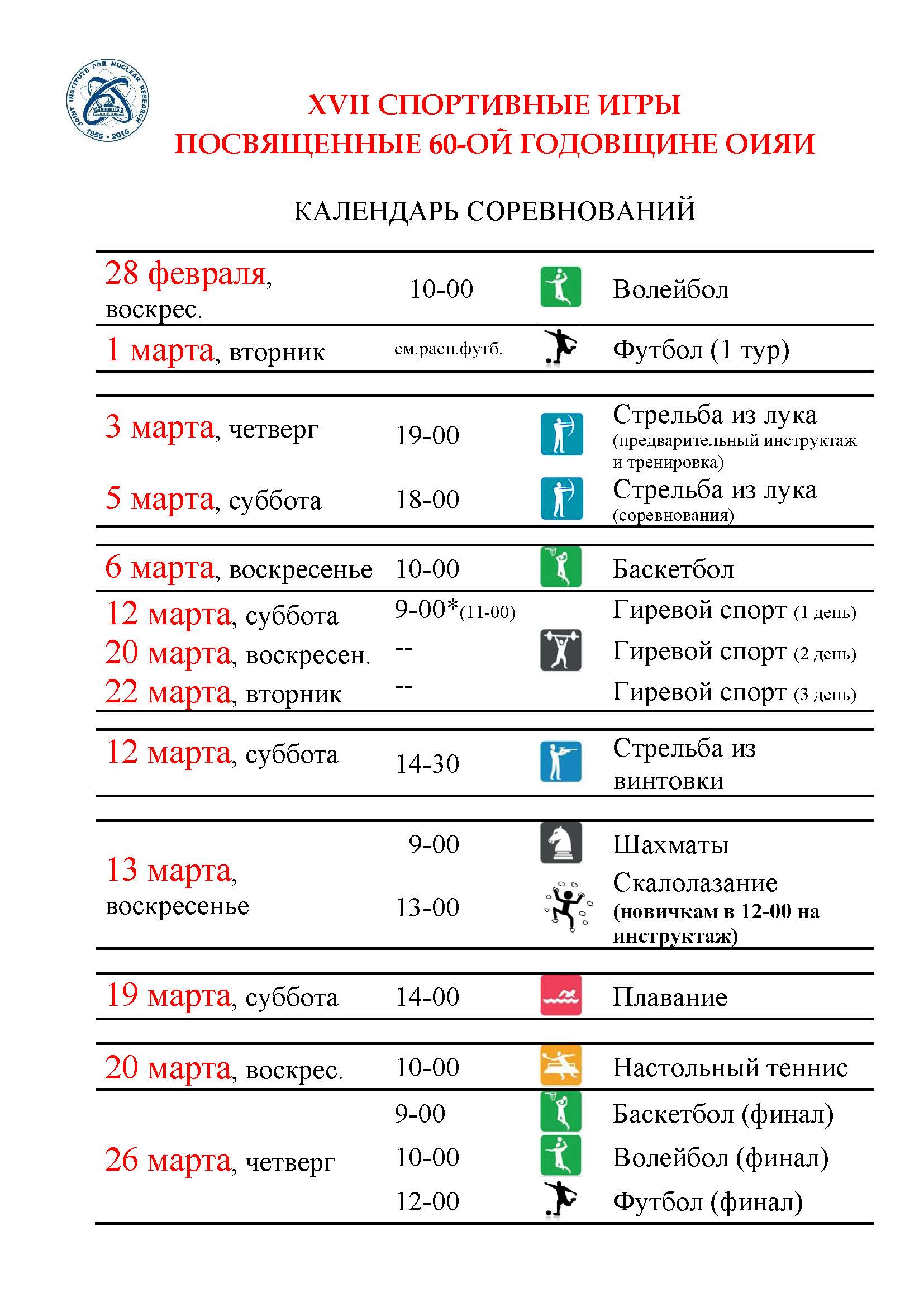 Календарь XVII Спортивных игр ОИЯИ