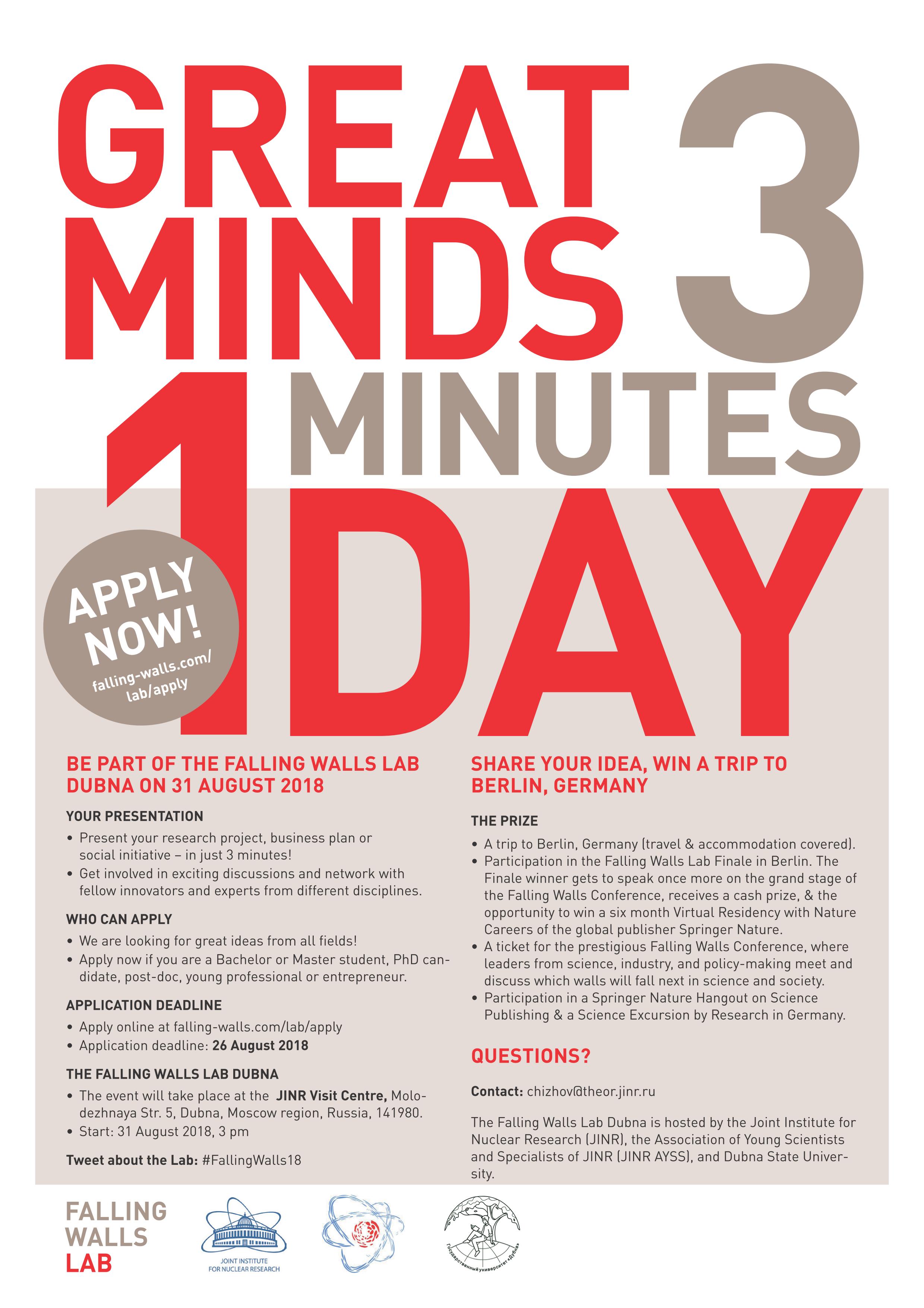 31 августа 2018 года в 14:00 часов в Визит-центре ОИЯИ (ул. Молодежная, д. 5) Объединенный институт ядерных исследований, Объединение молодых ученых и специалистов ОИЯИ и Государственный университет «Дубна» во второй раз проведут в Дубне конкурс Falling Walls Lab Dubna 2018.