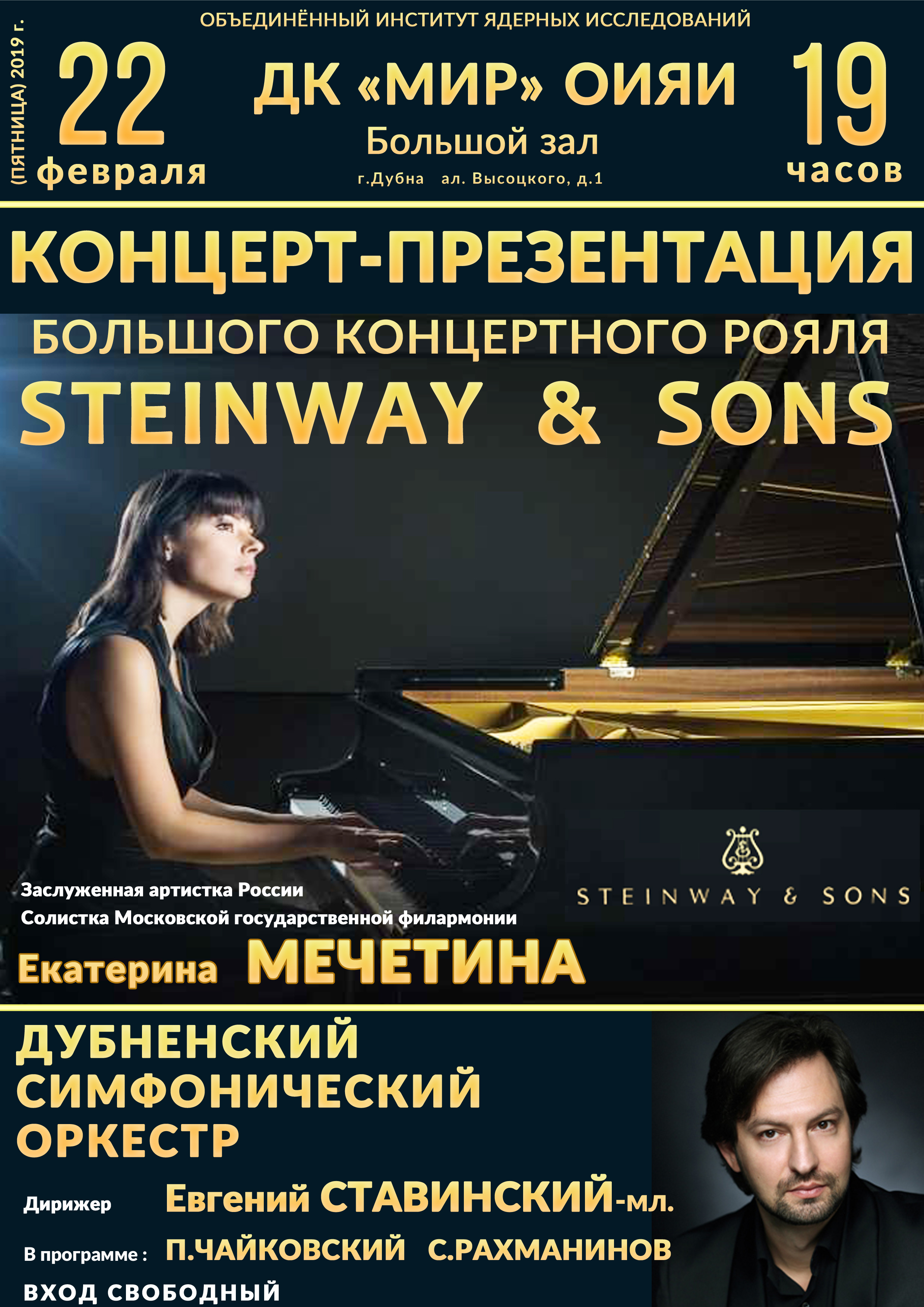 22 февраля 2019 года, в 19:00 часов в Доме культуры «Мир» ОИЯИ состоится концерт — презентация большого концертного рояля «Steinway&Sons» с участием Заслуженной артистки России, солистки Московской государственной филармонии Екатерины Мечетиной.