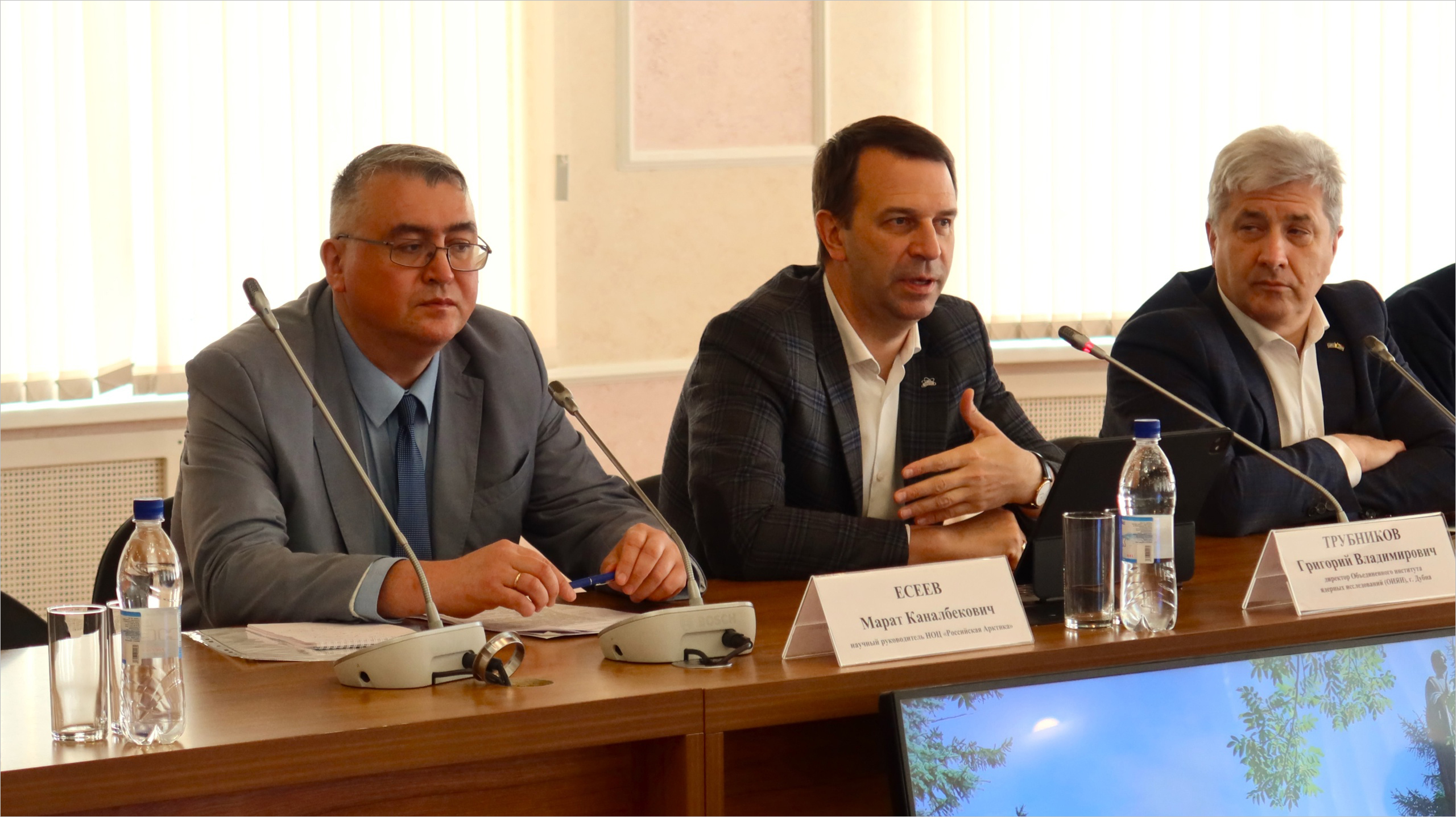 Круглый стол по развитию партнерской сети открыли Григорий Трубников и научный руководитель НОЦ мирового уровня «Российская Арктика» Марат Есеев. «Сбылась наша мечта четырехлетней давности собрать информационные центры на северной оконечности меридиана ОИЯИ. Нам нужно встречаться, делиться лучшими практиками, обсуждать проблемы, ставить новые цели и развивать новые форматы», — отметил Григорий Трубников. «Мы отсчитываем историю сотрудничества через информационный центр ОИЯИ в САФУ с 2022 года. Через совместные мероприятия проходит около 2 тысяч школьников в год, студенты участвуют в практиках и экспериментах, около 50 учителей в год повышают свою квалификацию. Наши студенты приняли участие в школе «Учителя будущего», — продолжил Марат Есеев, рассказывая об активной работе, ведущейся в архангельском ИЦ.