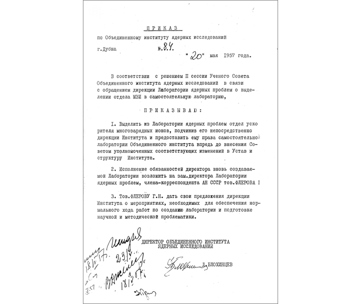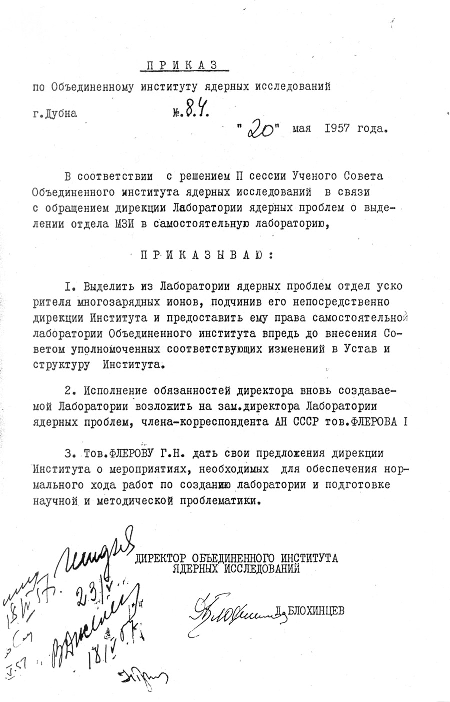 20 мая 1957 года приказ за подписью директора ОИЯИ Д. И. Блохинцева положил начало славной истории ЛЯР. В честь этого события 26 мая состоится торжественное заседание, посвященное 65-летию Лаборатории ядерных реакций. Начало в 16.00, место проведения — конференц-зал Лаборатории теоретической физики. Приглашаются все желающие!