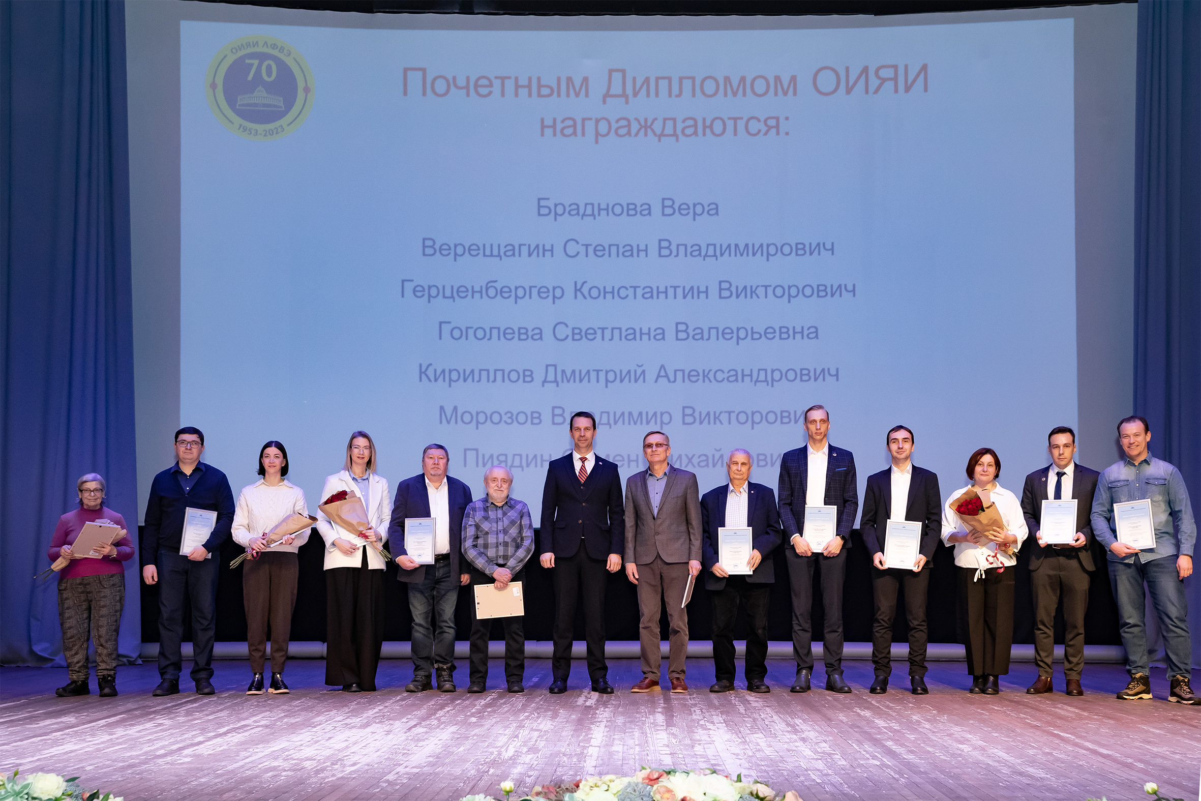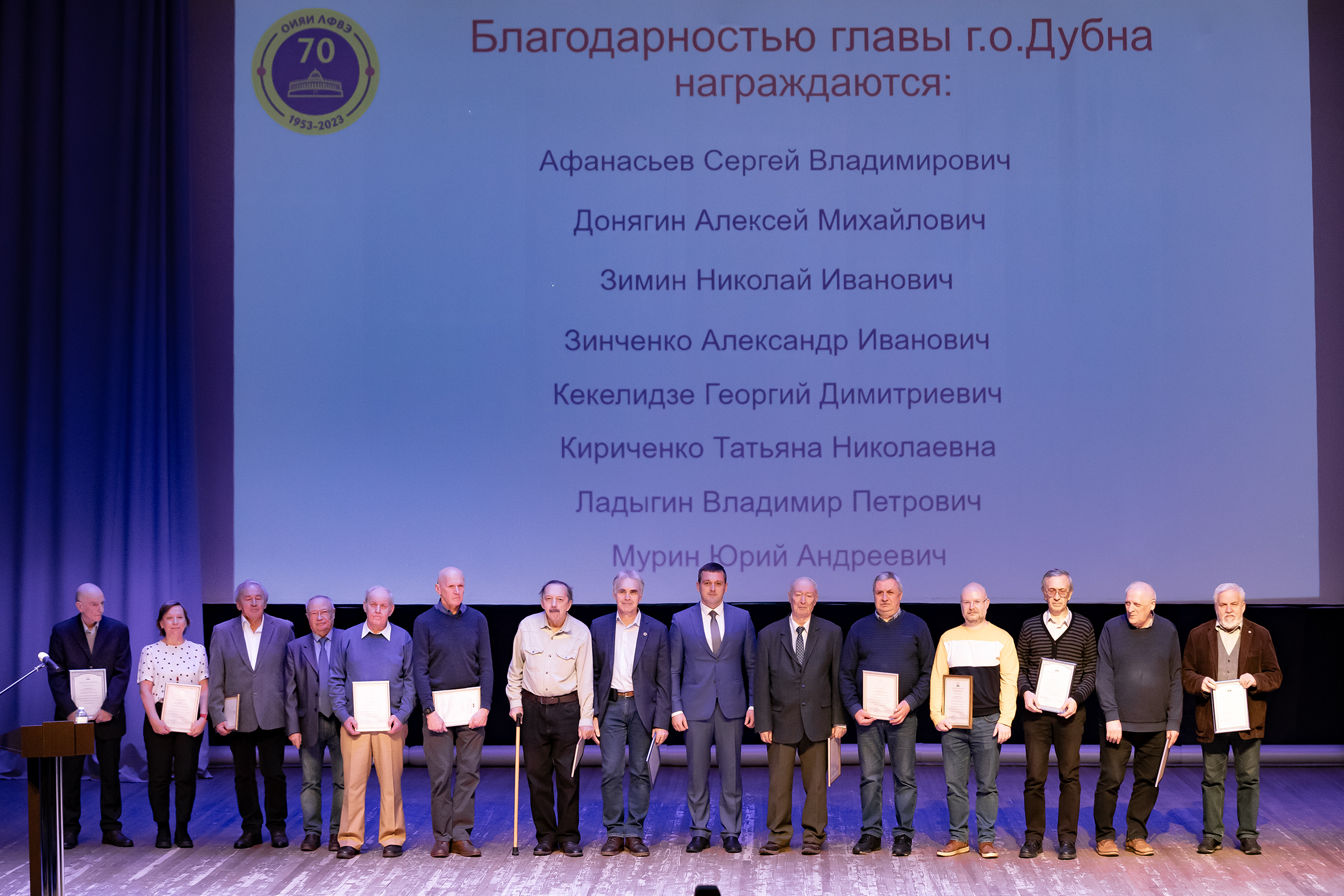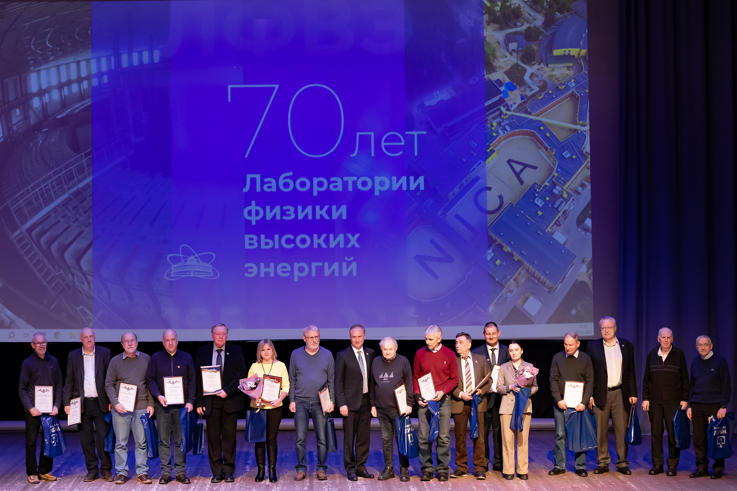 В честь 70-летия Лаборатории физики высоких энергий сорока семи ее сотрудникам были вручены награды: почетные дипломы ОИЯИ, почетные грамоты и благодарности главы городского округа Дубна и городского совета депутатов.