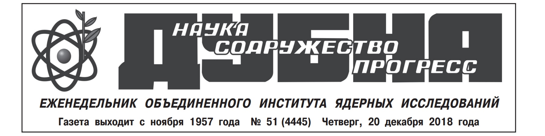 Latest issue of the JINR weekly newspaper #51, 20.12.18 News, 20 December 2018 Twitter Вконтакте Headlines: New neutron source. The first stage is completed; NASA and IBMP representatives visited JINR; “New trends in high-energy physics”; Remembering colleagues who have passed away (Jordan Georgiev Brankov); Workshops in Prague and Pilsen; At the Olympiad in Sofia Download #51 in pdf format (Rus)