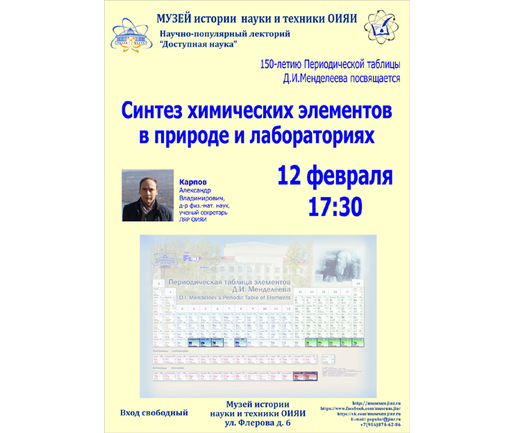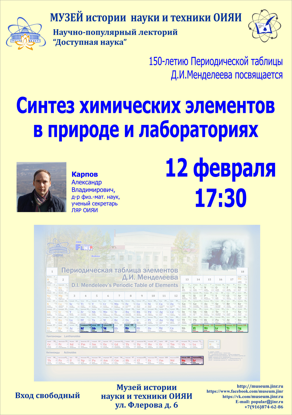 12 февраля 2019 г. в 17:30 в Музее истории науки и техники ОИЯИ (ул.Флерова д.6) в рамках научно-популярного лектория «Доступная наука» состоится лекция «Синтез химических элементов в природе и лабораториях». 150-летию Периодической таблицы Д.И. Менделеева посвящается.
