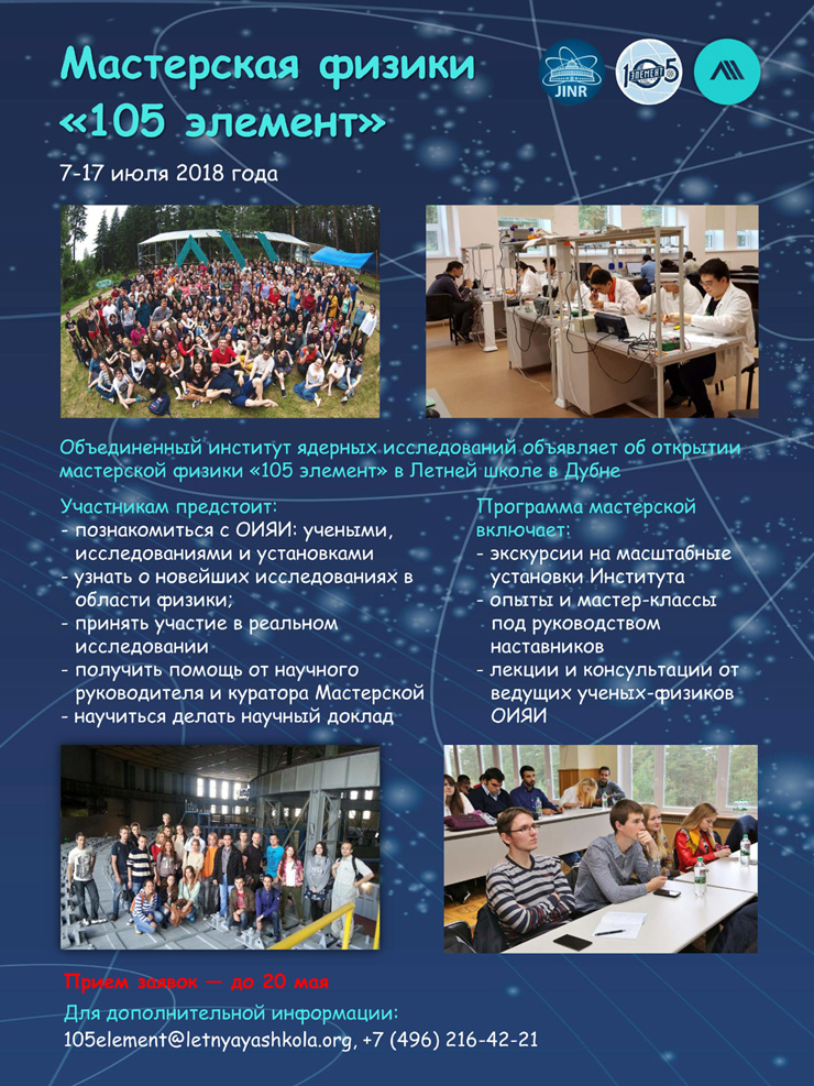 Напоминаем, что подача заявок на участие в физической мастерской ОИЯИ «105 элемент» на Летней школе 2018 заканчивается 20 мая 2018 г.
