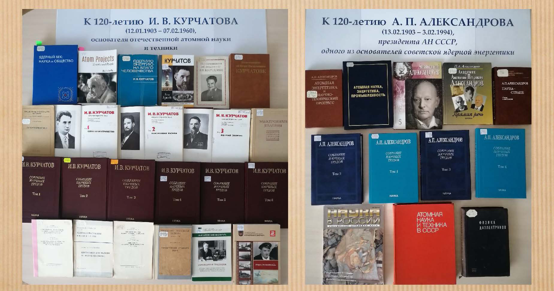 The exhibition presents collections of scientific papers, selected proceedings, books and collections with memories of scientists, engineers, prominent figures of the location country of JINR about the life and work of Igor Kurchatov and Anatoly Alexandrov. Their names are inextricably linked with Laboratory No. 2, the Institute of Atomic Energy (now the National Research Center “Kurchatov Institute”), the Soviet atomic project, the formation of nuclear energy in Russia, the development and testing of the atomic bomb. Most of the literature presented is devoted to these topics.