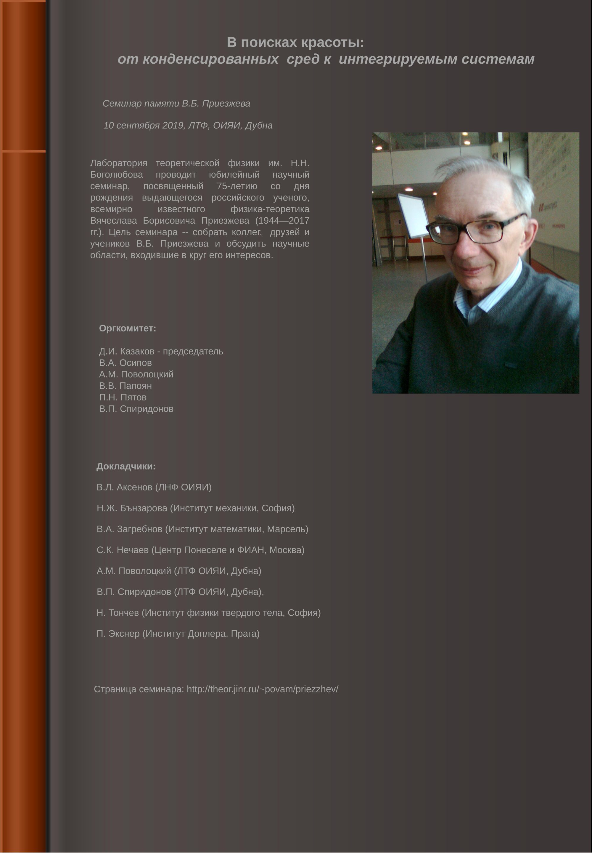 On 10 September 2019, the Bogoliubov Laboratory of Theoretical Physics JINR holds a memorial scientific seminar dedicated to the 75th anniversary of the birth of the outstanding Russian scientist, world-famous theoretical physicist Vyacheslav Borisovich Priezzhev (1944-2017). The purpose of the seminar is to gather colleagues, friends, and pupils of V. B. Priezzhev and to discuss the scientific areas of his interest.