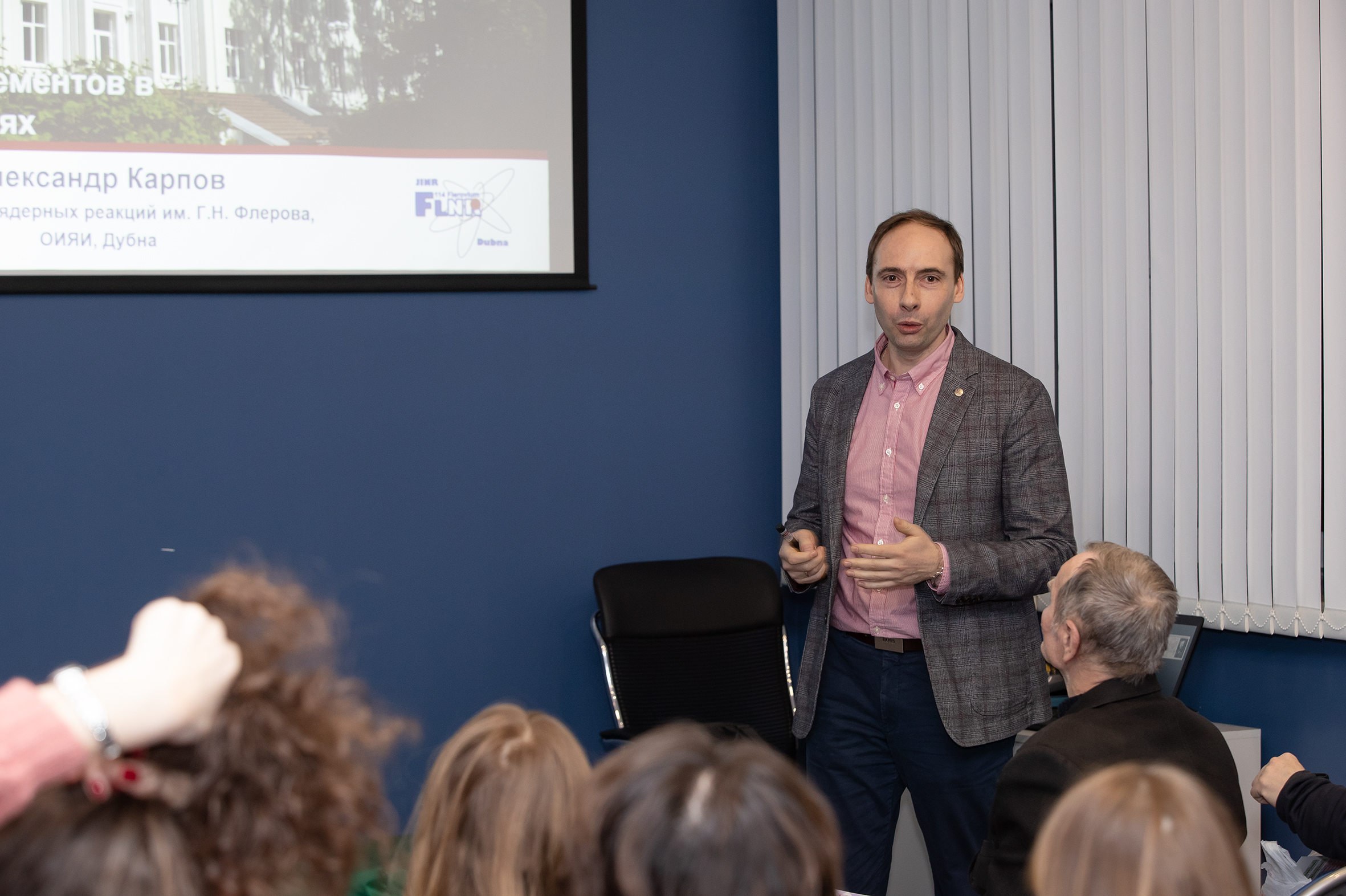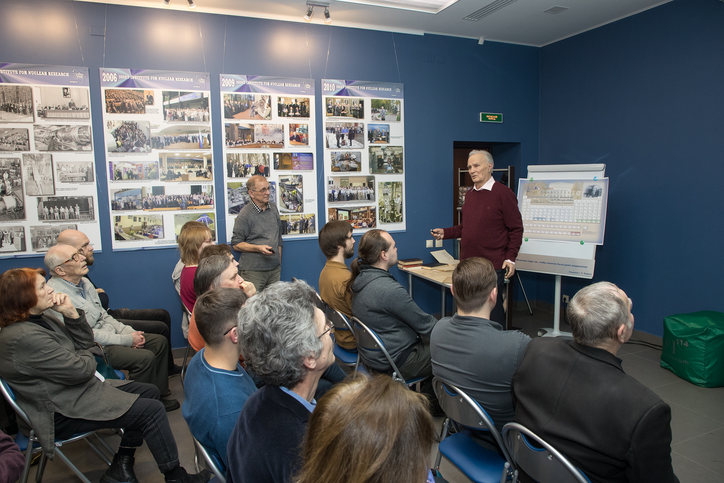 Then, the lecture “History of discovery in first person: synthesis of elements 102 and 103 of the Mendeleev’s Table” that had been planned long ago took place. It was delivered by JINR veteran, Doctor of Physical and Mathematical Sciences E.D. Donets. Being a co-author of these discoveries, the lecturer shared numerous valuable details and highlighted the leading role of FLNR JINR in the international collaboration on search for superheavy elements. It was a full house!
