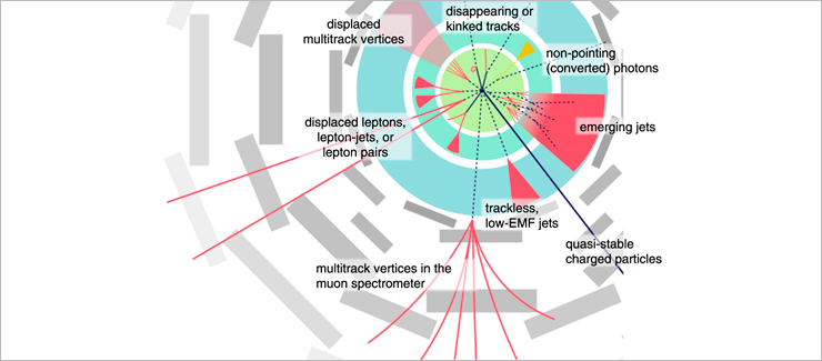 Начиная с 2029 г. предусмотрена работа LHC при повышенной светимости (High-Luminosity LHC, HL-LHC) — вплоть до 7,5 · 1034 cм−2 · с−1, что позволит увеличить статистику более чем на порядок (Lint~3000 фб−1). Это обеспечит дальнейшее тщательное изучение природы бозона Хиггса и поиск возможных отклонений от предсказаний Стандартной модели (СМ), указывающих на проявление сигналов новых физических явлений. В частности, важно существенно повысить точность измерения констант связи бозона Хиггса (ожидаемая точность ~3–5%), так как наблюдаемый вклад от рождения новых частиц может оказаться гораздо меньше текущей точности измерений (10–30%). Увеличение статистики данных позволит осуществить поиск процессов за рамками СМ, которые характеризуются сечениями, лежащими ниже порога текущей чувствительности экспериментальных измерений (сценарии с частицами-кандидатами на роль темной материи, расширенные суперсимметричные модели, теории хиггсовского портала и т.д.). Среди них особый интерес представляют процессы, в которых ожидается рождение так называемых долгоживущих новых частиц (Long-Lived Particles, LLP) с вершинами распада, находящимися на значительном (от нескольких сантиметров до десятков метров) расстоянии от точки взаимодействия пучков протонов (рис. 2). Также различные сценарии поиска новой физики предсказывают рождение частиц с поперечным импульсом, намного превышающим их массу (boosted objects). Как следствие, продукты их распада представляют собой очень узкие струи, пересекающиеся в пространстве.