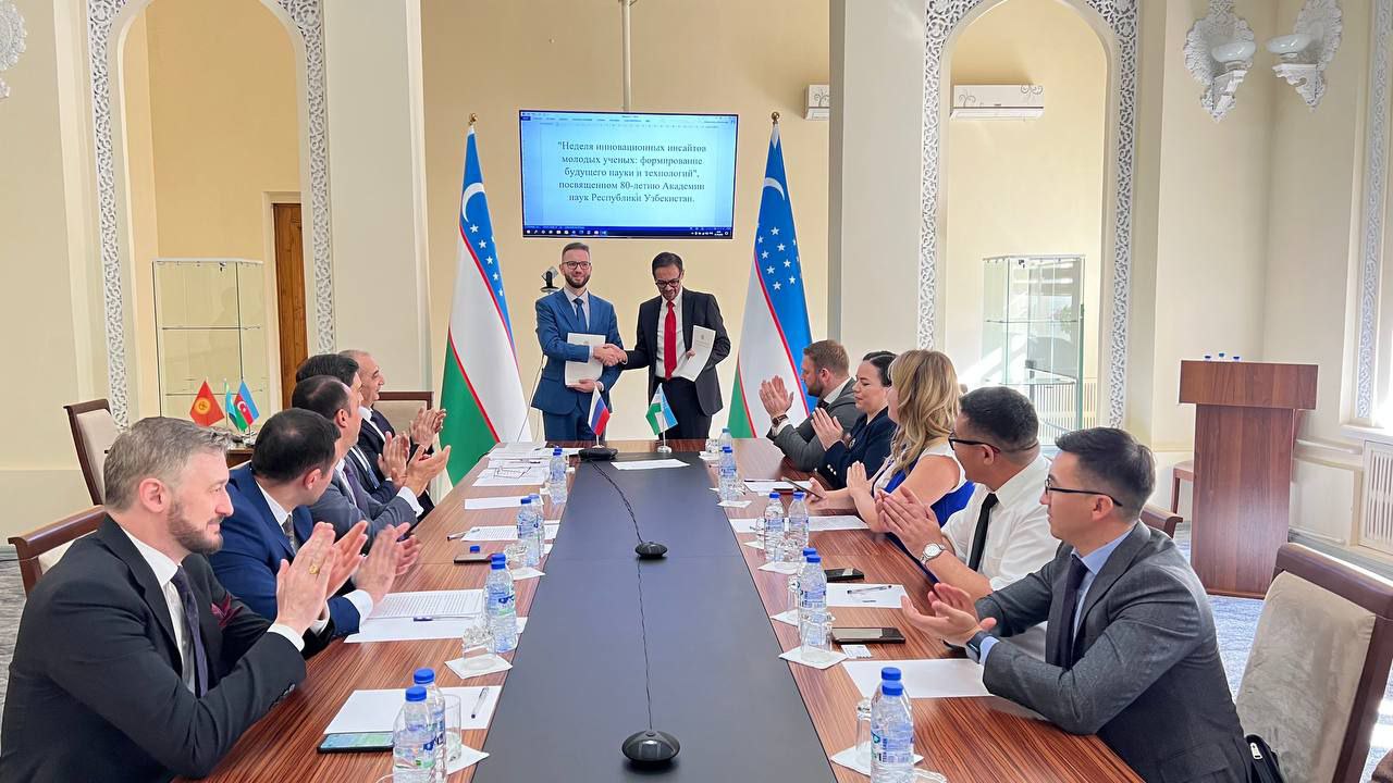 В Узбекистане состоялось торжественное подписание Письма о намерениях между Объединением молодых ученых и специалистов ОИЯИ и Советом молодых ученых Академии наук Республики Узбекистан. Документ подписали член Совета ОМУС от Лаборатории физики высоких энергий ОИЯИ Михаил Шандов, и председатель СМУ АН РУз Саид Гулямов. Подписание состоялось на заседании Совета молодых ученых Международной ассоциации академий наук в рамках проведения «Недели инновационных инсайтов молодых ученых: формирование будущего науки и технологий» в Узбекистане.