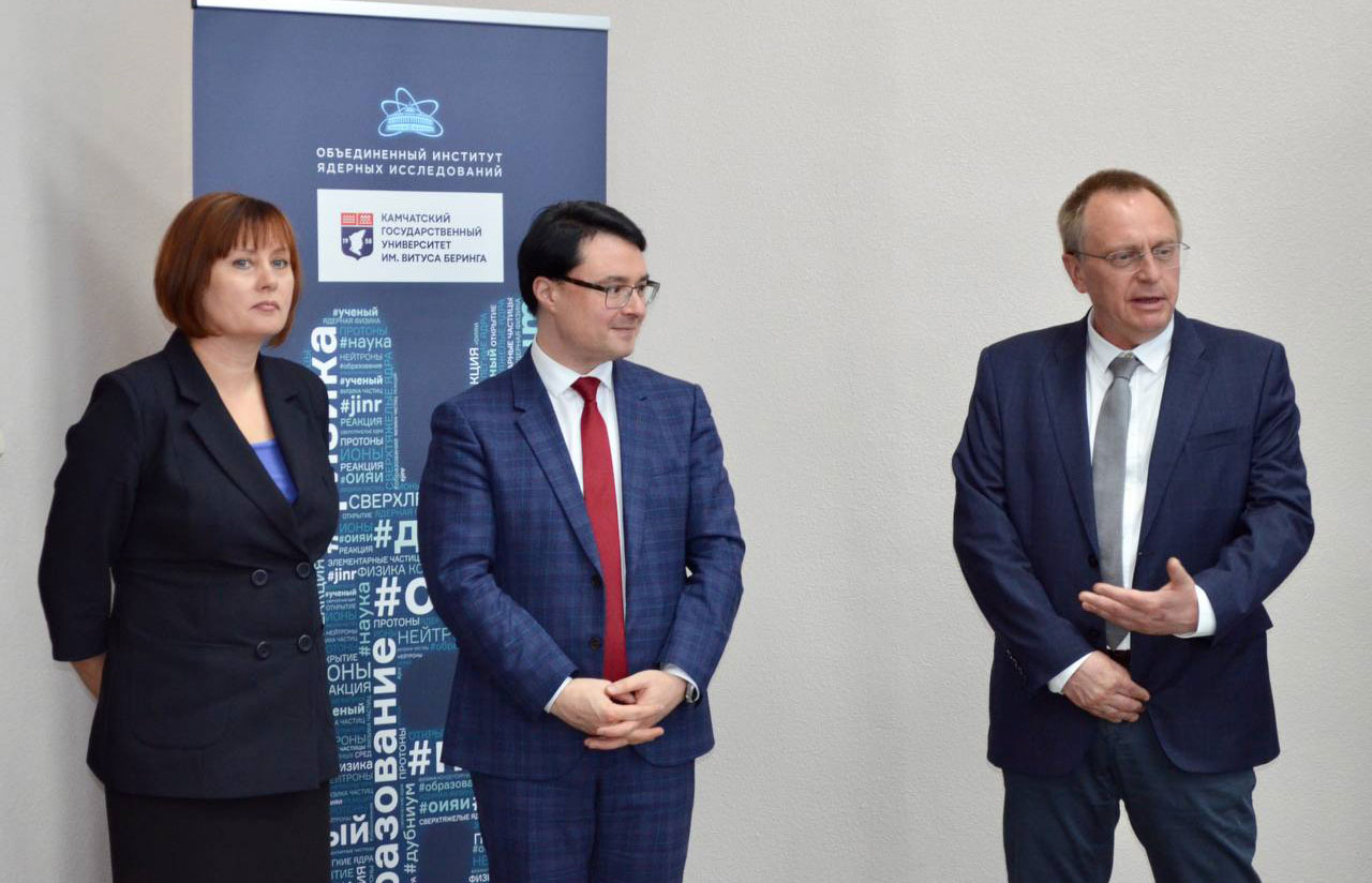 Welcoming participants, Alexandra Lebedeva noted the uniqueness and attractiveness of the Kamchatka region from the point of view of research in geophysics, ecology, and life sciences. She expressed hope that joint research by local scientific organizations, KamGU, and JINR would be able to lead to excellent scientific results. Alexandra Lebedeva noted that the Government of the region was currently paying special attention to improving the quality of school education in natural sciences. She also highlighted a significant role of the Information Centre. In his turn, Sergey Nedelko noted that one of the statutory objectives of JINR was the development of science in the Member States, and in that regard, the Institute was aimed at active work in training young staff. The Institute offers not only a wide range of educational opportunities of the JINR University Centre, but also the use of the Institute’s world-class scientific infrastructure for teaching schoolchildren, students, and postgraduates in the profile directions.