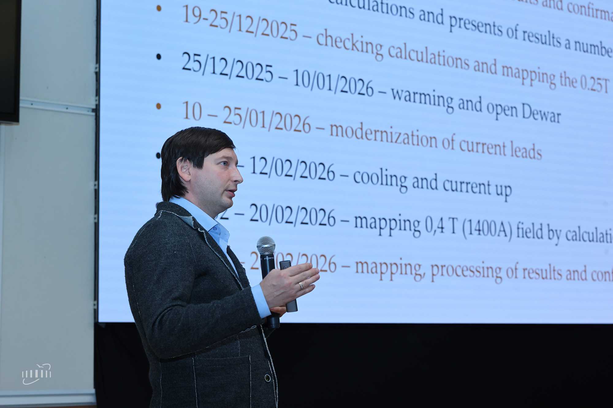 He spoke about the significant progress in the work on the MPD magnet. Improvements of the thermal insulation and components of the chimney’s internal structure finished. During the cooling of the collider in the autumn, the stable operation of the magnet with a field of up to 0.3 T was confirmed. The next step is magnetic field measurements at 0.2 and 0.3 T. It is planned to achieve 0.5 T in the first months of 2026.