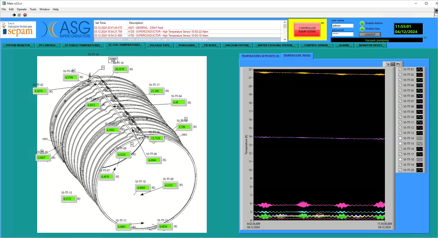The figure with the readings of the temperature sensors installed inside the cooled coil was obtained using the control software. The cooling process continues according to plan. The figure shows that the cable in the upper part of the coil connected to the control Dewar has not fully cooled yet, but this is normal at this stage