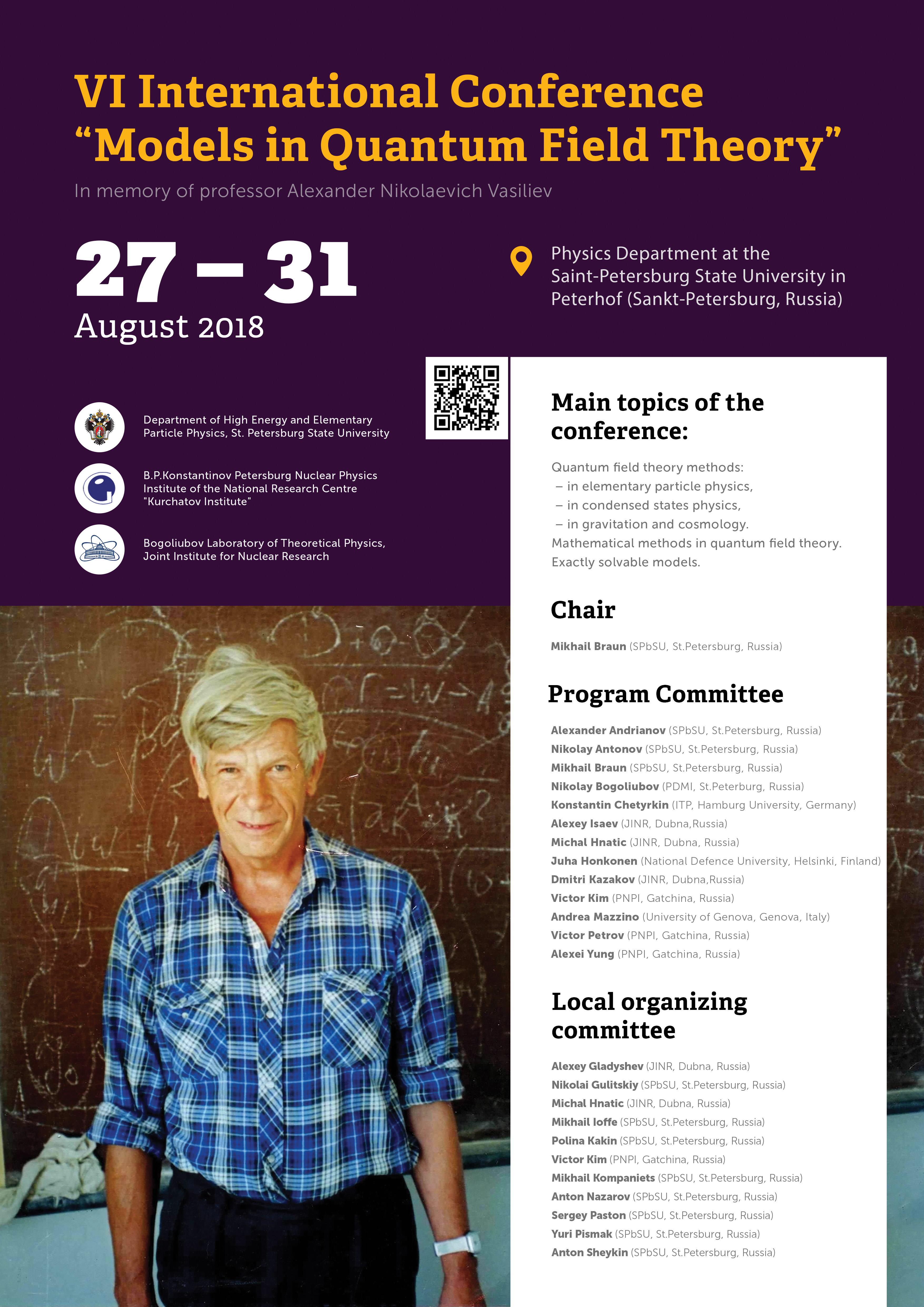 В понедельник, 27 августа 2018 г. начинает свою работу 6-я Международная конференция «Модели в квантовой теории поля» (MQFT-2018), посвященная памяти профессора Александра Николаевича Васильева. Конференция MQFT-2018 будет проходить с 27 по 31 августа в живописном пригороде Санкт-Петербурга — Петергофе.