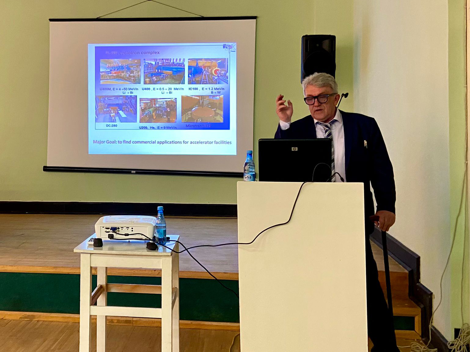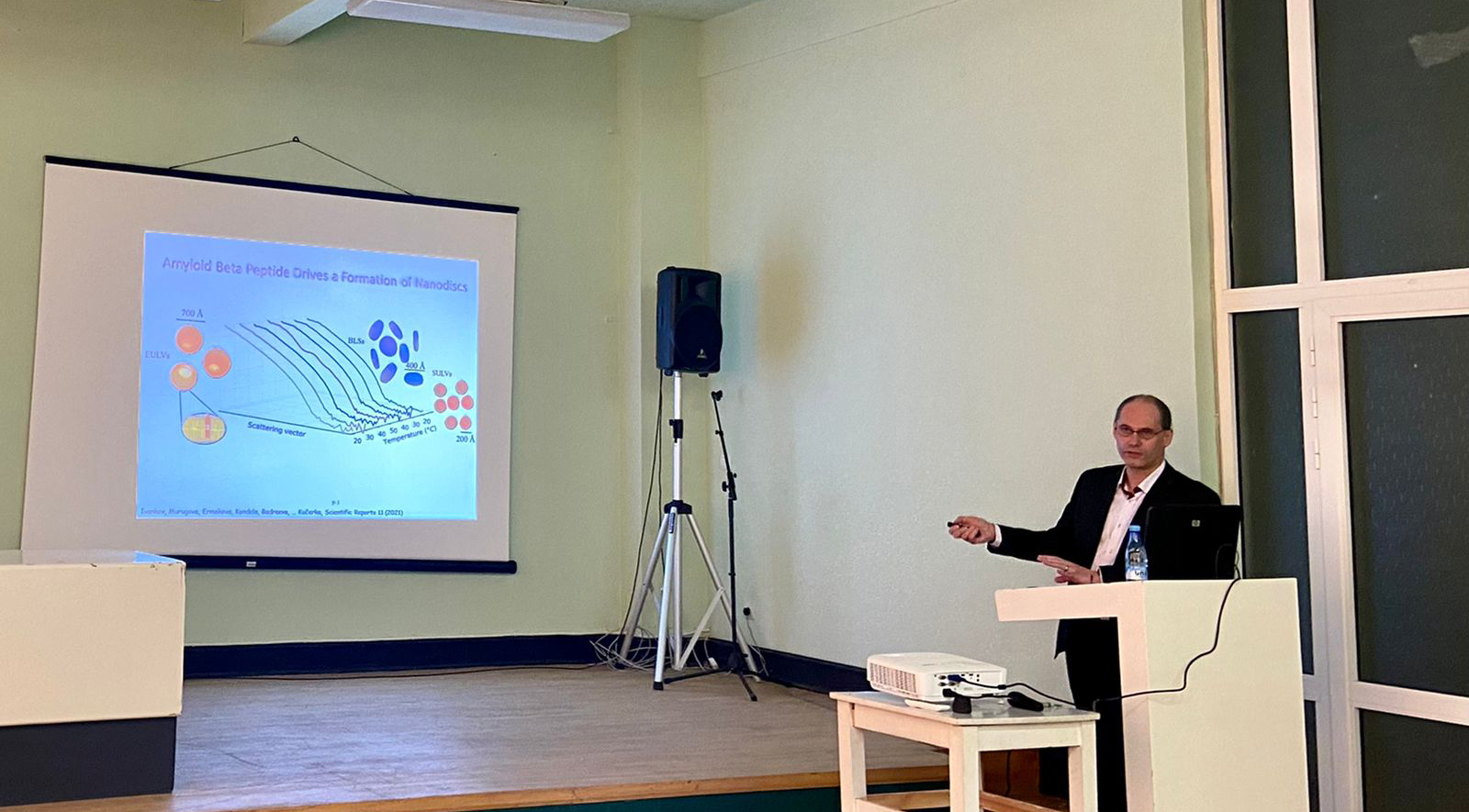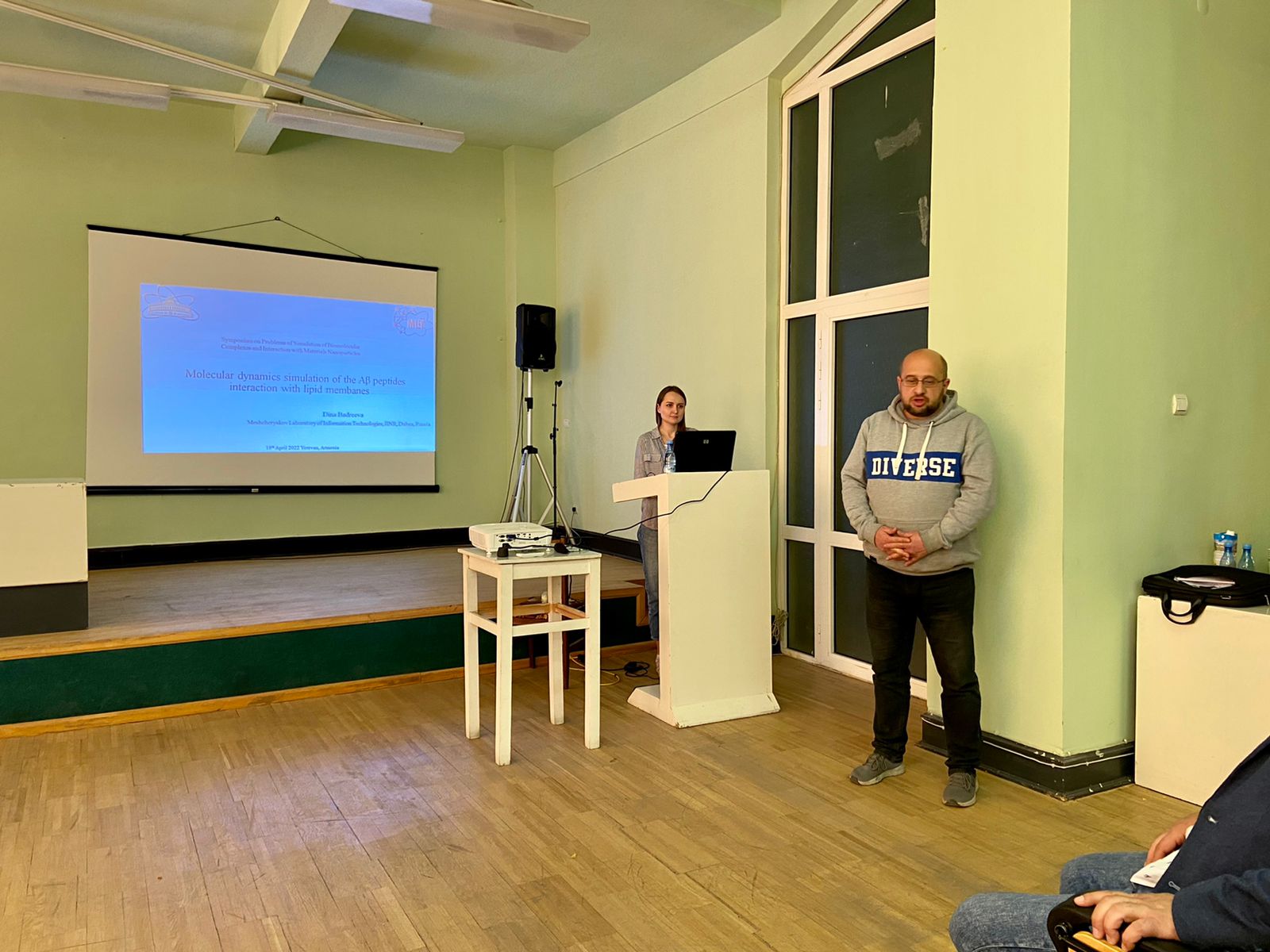 Заместитель начальника НХП «Центр прикладной физики» ОИЯИ Александр Нечаев представил доклад об ионно-трековой технологии и применении ускоренных тяжелых ионов в ЦПФ ЛЯР ОИЯИ. Заместитель директора ЛНФ Норберт Кучерка рассказывал об изучении биомембран, имитирующих доклинические конформационные заболевания, с помощью нейтронного рассеяния. Доклад стажера-исследователя ЛИТ Дины Бадреевой посвящен молекулярно-динамическому моделированию взаимодействия пептидов Aβ с липидными мембранами, а старший научный сотрудник ЛИТ Зариф Шарипов ознакомил слушателей с методами молекулярной динамики для моделирования процессов взаимодействия ускоренных тяжелых ионов и нанокластеров с конденсированными средами.