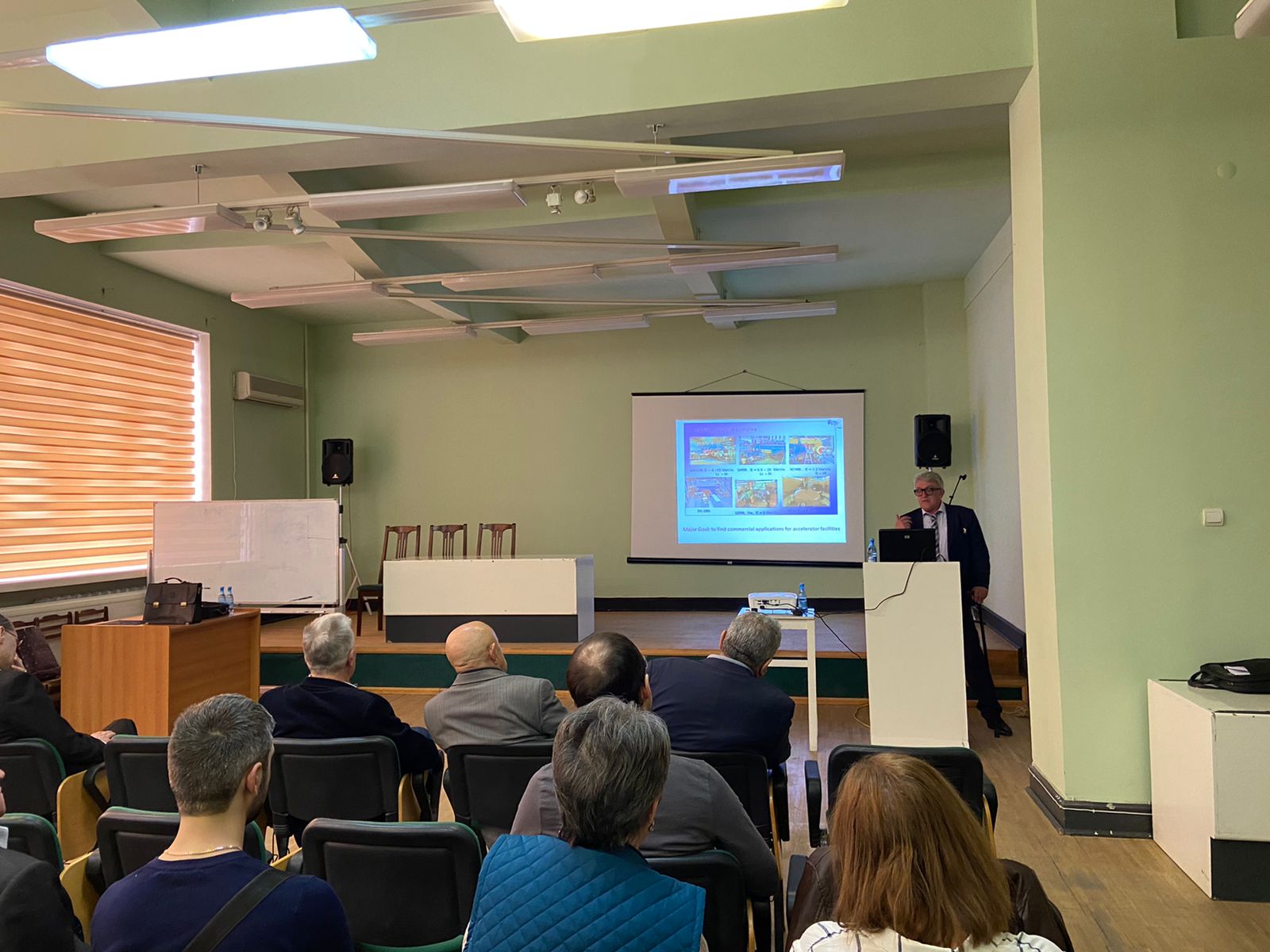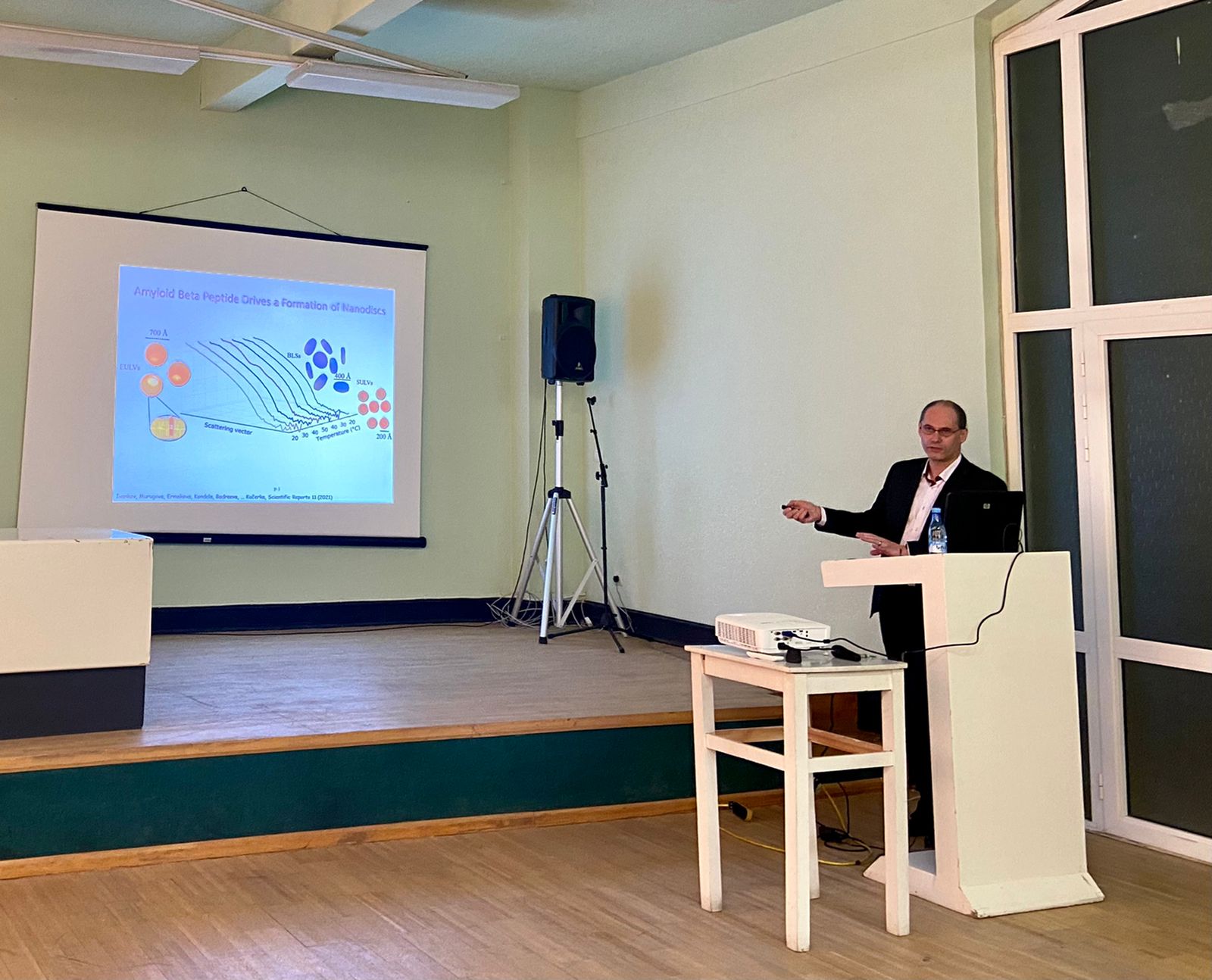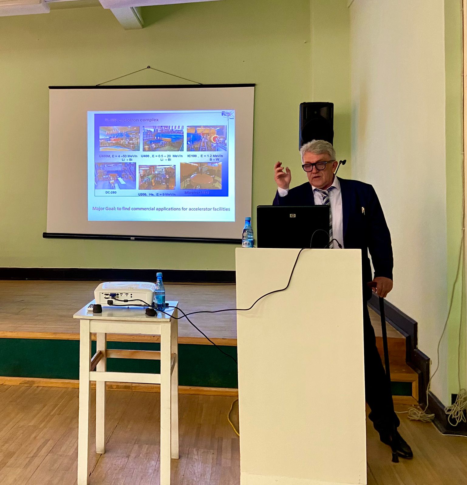 Заместитель начальника НХП «Центр прикладной физики» ОИЯИ Александр Нечаев представил доклад об ионно-трековой технологии и применении ускоренных тяжелых ионов в ЦПФ ЛЯР ОИЯИ. Заместитель директора ЛНФ Норберт Кучерка рассказывал об изучении биомембран, имитирующих доклинические конформационные заболевания, с помощью нейтронного рассеяния. Доклад стажера-исследователя ЛИТ Дины Бадреевой посвящен молекулярно-динамическому моделированию взаимодействия пептидов Aβ с липидными мембранами, а старший научный сотрудник ЛИТ Зариф Шарипов ознакомил слушателей с методами молекулярной динамики для моделирования процессов взаимодействия ускоренных тяжелых ионов и нанокластеров с конденсированными средами.